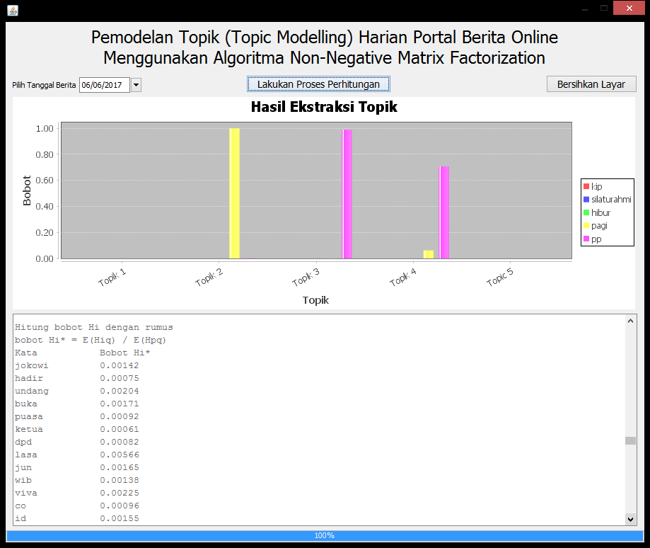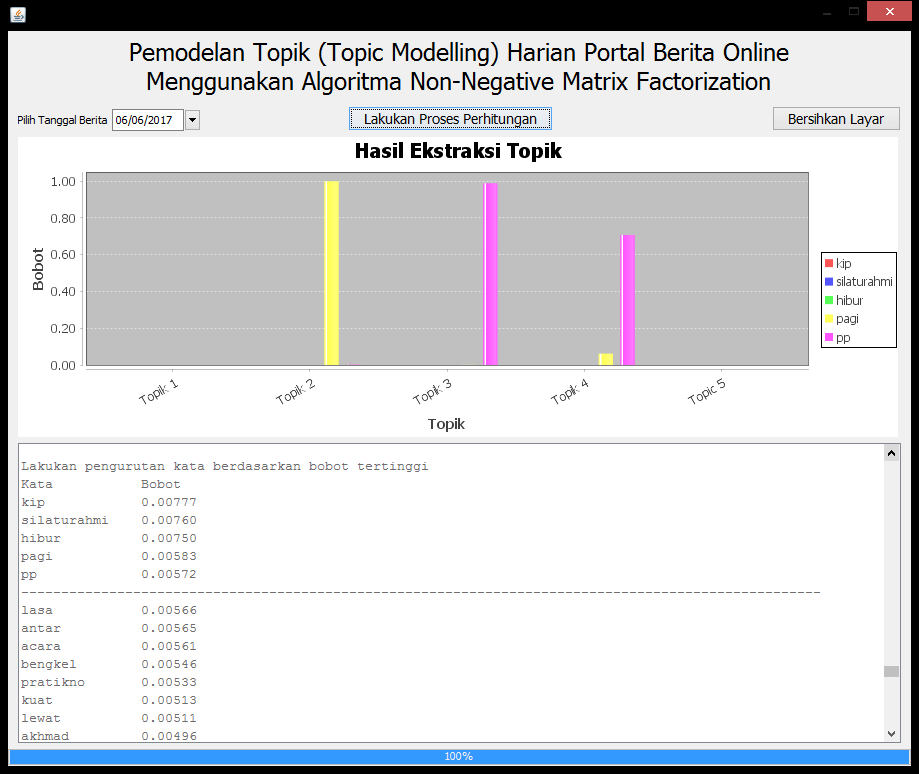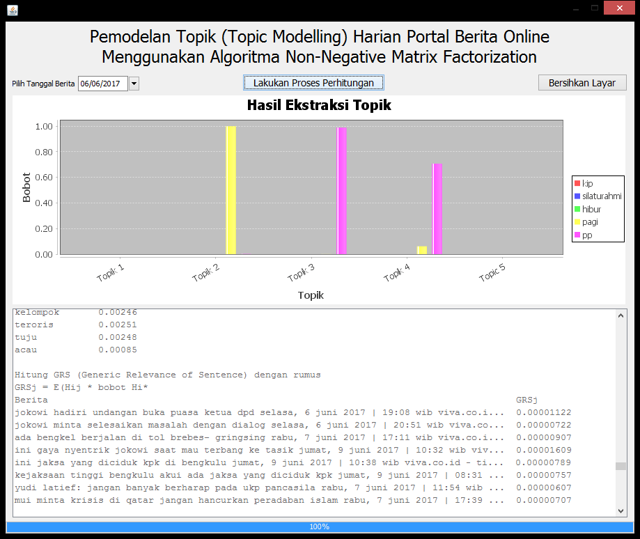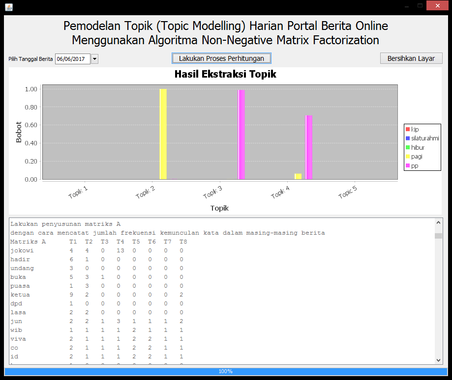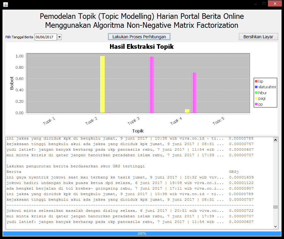 | Fungsi utama aplikasi ini adalah untuk mendapatkan topik dari sekumpulan artikel yang tersedia dalam database. Setelah melakukan pemilihan tanggal berita, maka sistem akan mengumpulkan semua artikel pada tanggal tersebut, kemudian melakukan proses perhitungan untuk mendapatkan skor dari masing-masing topik. Skor tersebut kemudian akan diurutkan berdasarkan skor tertinggi, dan kemudian akan 5 topik terbaik akan ditampilkan pada layar. Proses perhitungan juga dicatat dalam log untuk memudahkan pengguna menganalisa nilai variabel dan skor yang terjadi pada saat proses perhitungan. | |