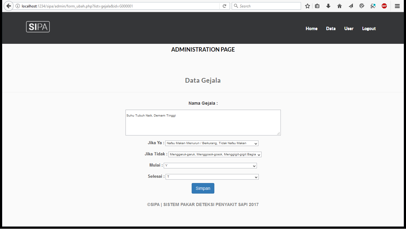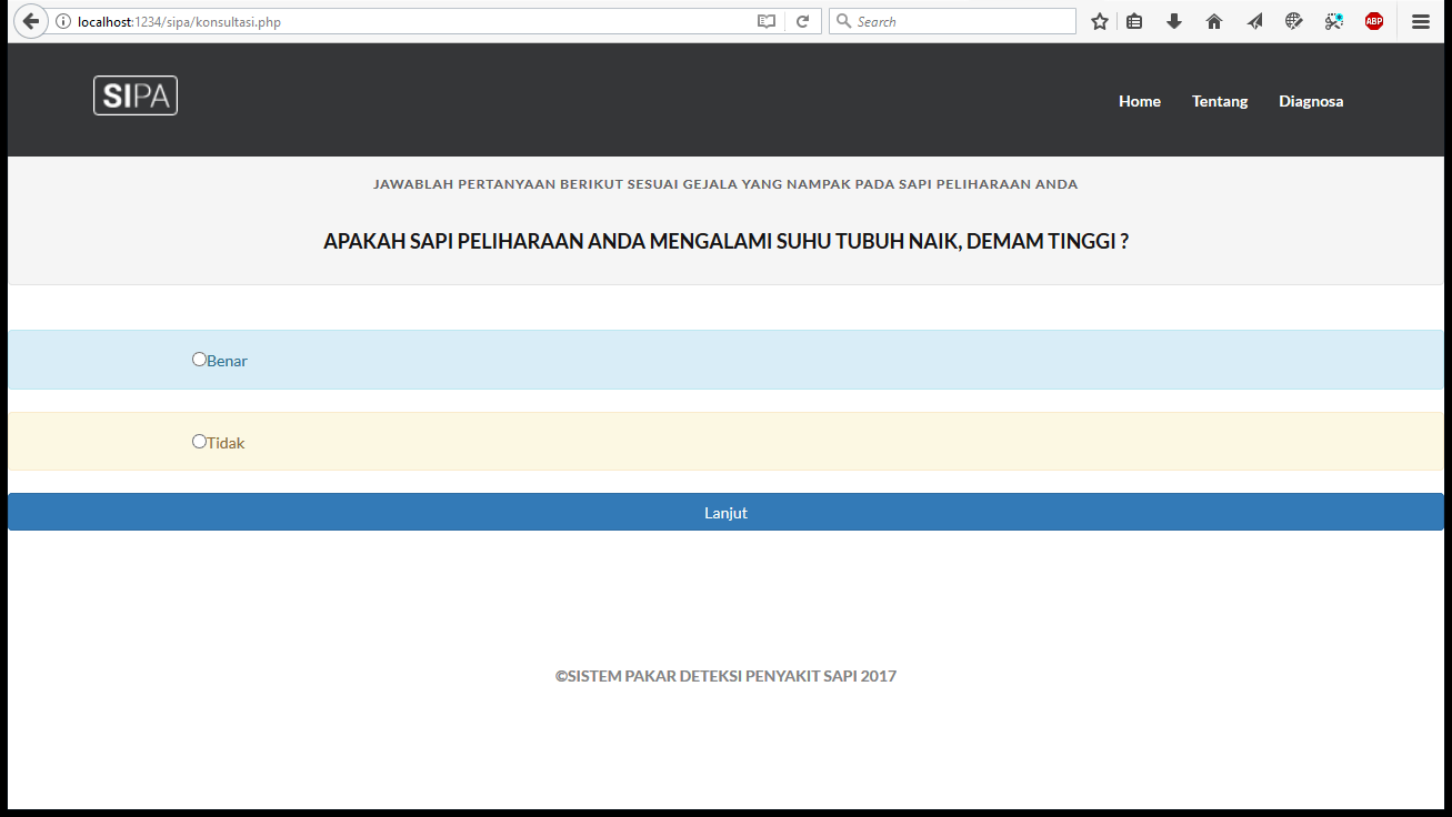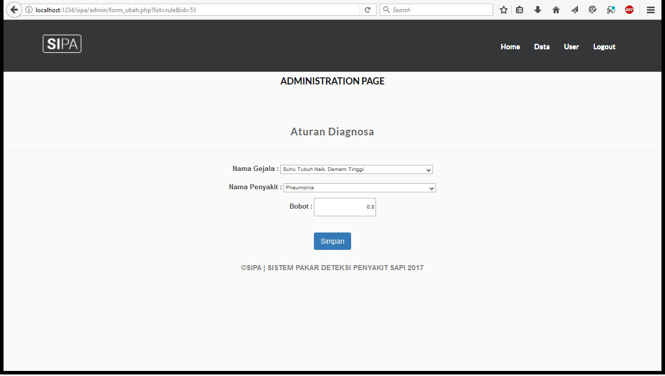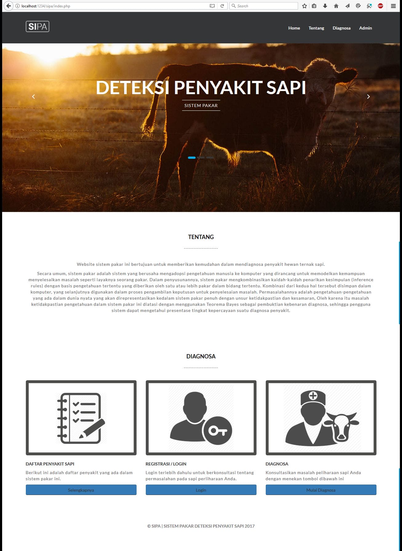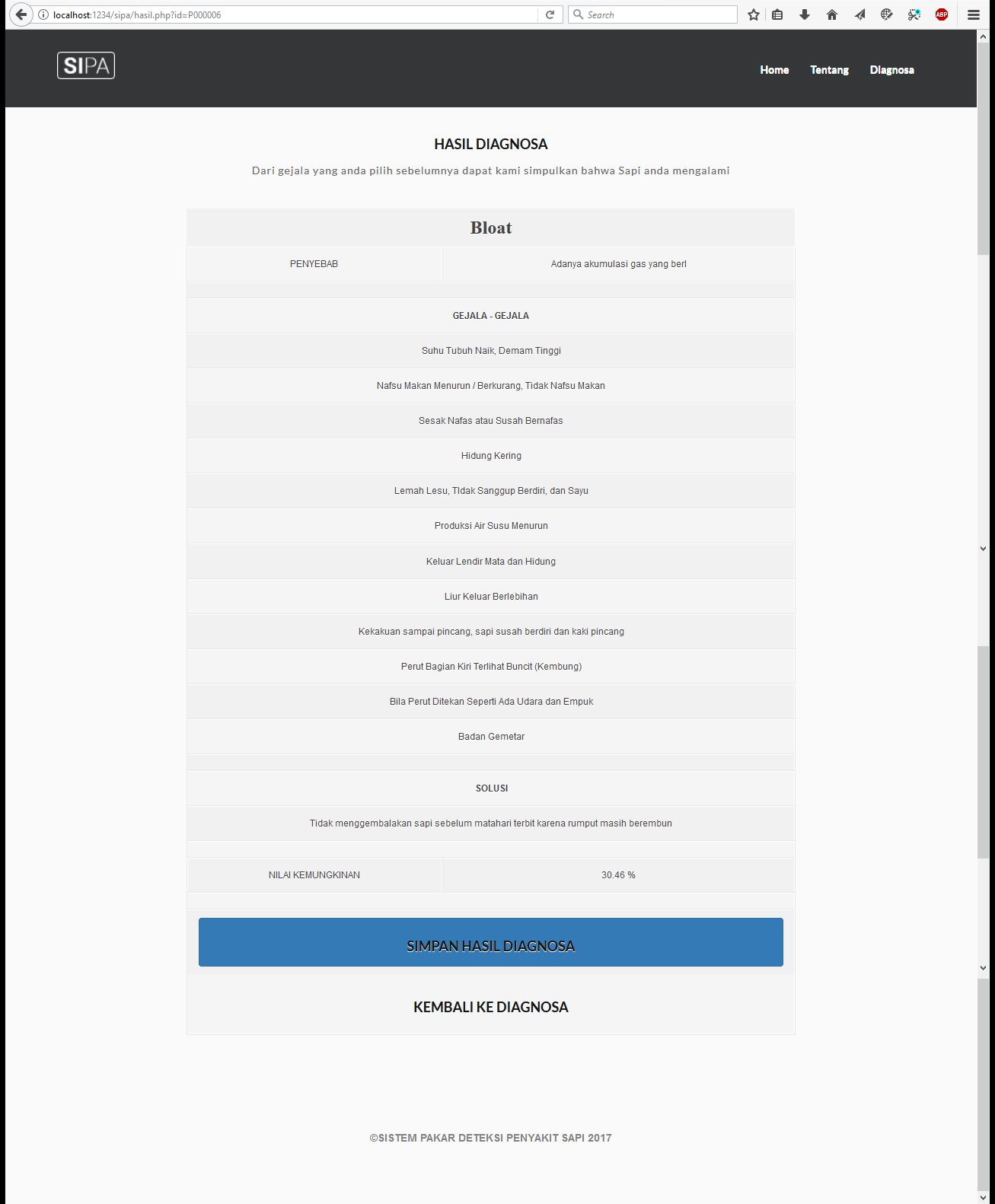 | Fungsi utama aplikasi ini adalah untuk melakukan diagnosa penyakit hewan ternak berdasarkan gejala-gejala yang diinputkan oleh pengguna. Setelah pengguna menginputkan gejala-gejala yang timbul, maka sistem akan melakukan perhitungan menggunakan input gejala tersebut dan kemudian mendapatkan sebuah kesimpulan diagnosa, yaitu penyakit hewan ternak tersebut beserta gejala-gejala dan solusi untuk mencegah penyakit tersebut. Hasil diagnosa ini kemudian dapat disimpan ke dalam database apabila diperlukan. Metode yang digunakan adalah metode Naive Bayes. Tutorial metode ini dapat dilihat pada link diatas. | |