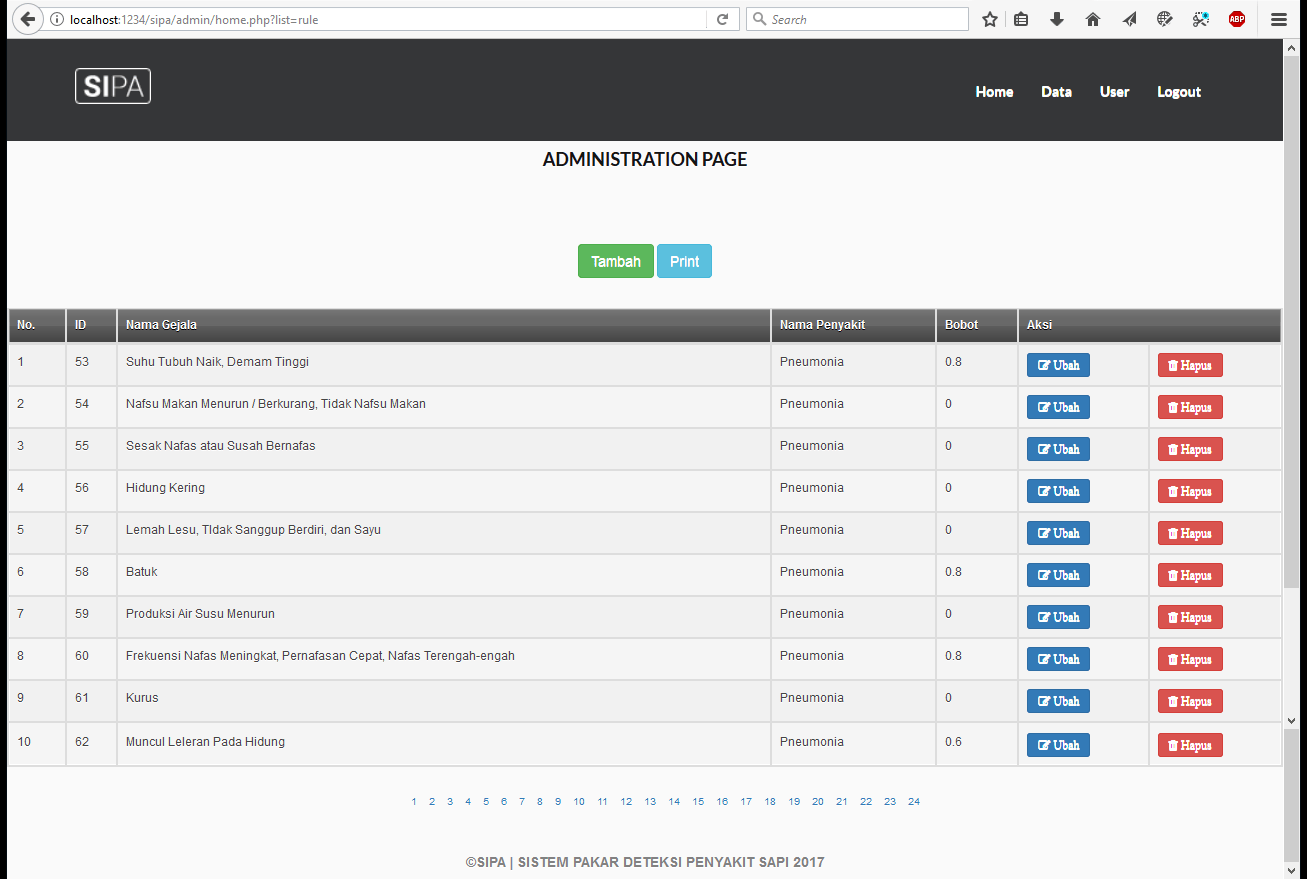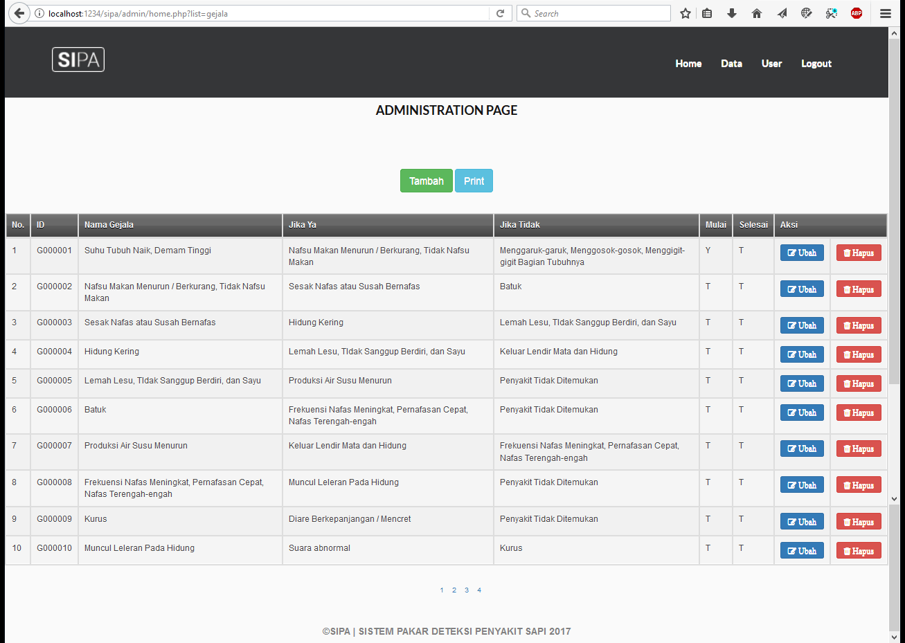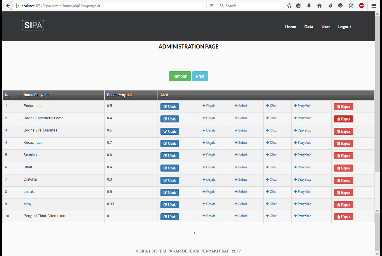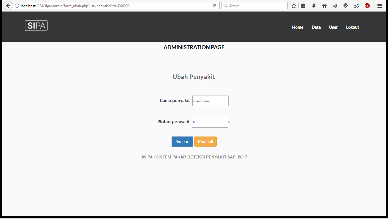 | Fungsi utama aplikasi ini adalah untuk melakukan diagnosa penyakit hewan ternak berdasarkan gejala-gejala yang diinputkan oleh pengguna. Setelah pengguna menginputkan gejala-gejala yang timbul, maka sistem akan melakukan perhitungan menggunakan input gejala tersebut dan kemudian mendapatkan sebuah kesimpulan diagnosa, yaitu penyakit hewan ternak tersebut beserta gejala-gejala dan solusi untuk mencegah penyakit tersebut. Hasil diagnosa ini kemudian dapat disimpan ke dalam database apabila diperlukan. Metode yang digunakan adalah metode Naive Bayes. Tutorial metode ini dapat dilihat pada link diatas. | |