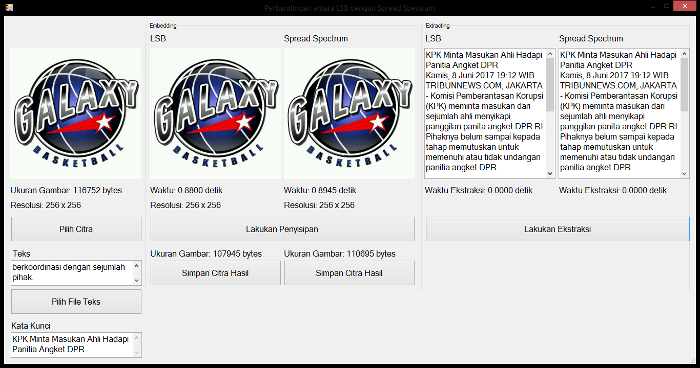 | Metode Tambahan | DCT (Discrete Cosine Transform) dan LSB (Least Significant Bit) |