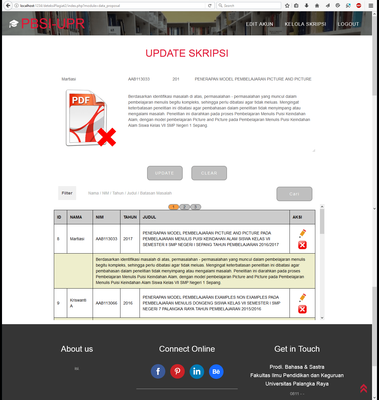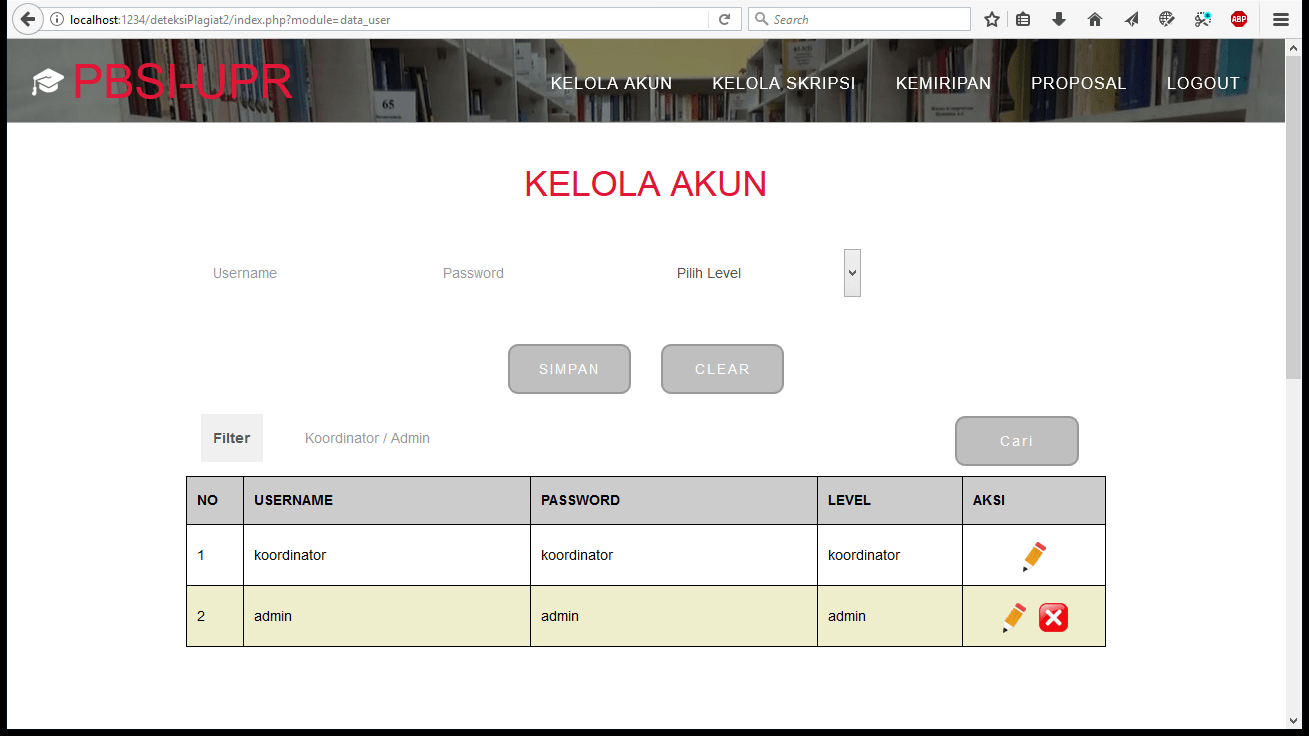 | Pengguna dengan status koordinator memiliki akses pada halaman kelola akun dan proposal mahasiswa. Koordinator memiliki hak akses utuh untuk memanipulasi data koordinator dan data semua admin yang tersedia. Halaman proposal mahasiswa digunakan untuk memanipulasi data input proposal yang sudah disimpan oleh pengguna yang tidak login. Koordinator juga dapat melihat hasil perhitungan skor kemiripan atas masing-masing data proposal tersebut|