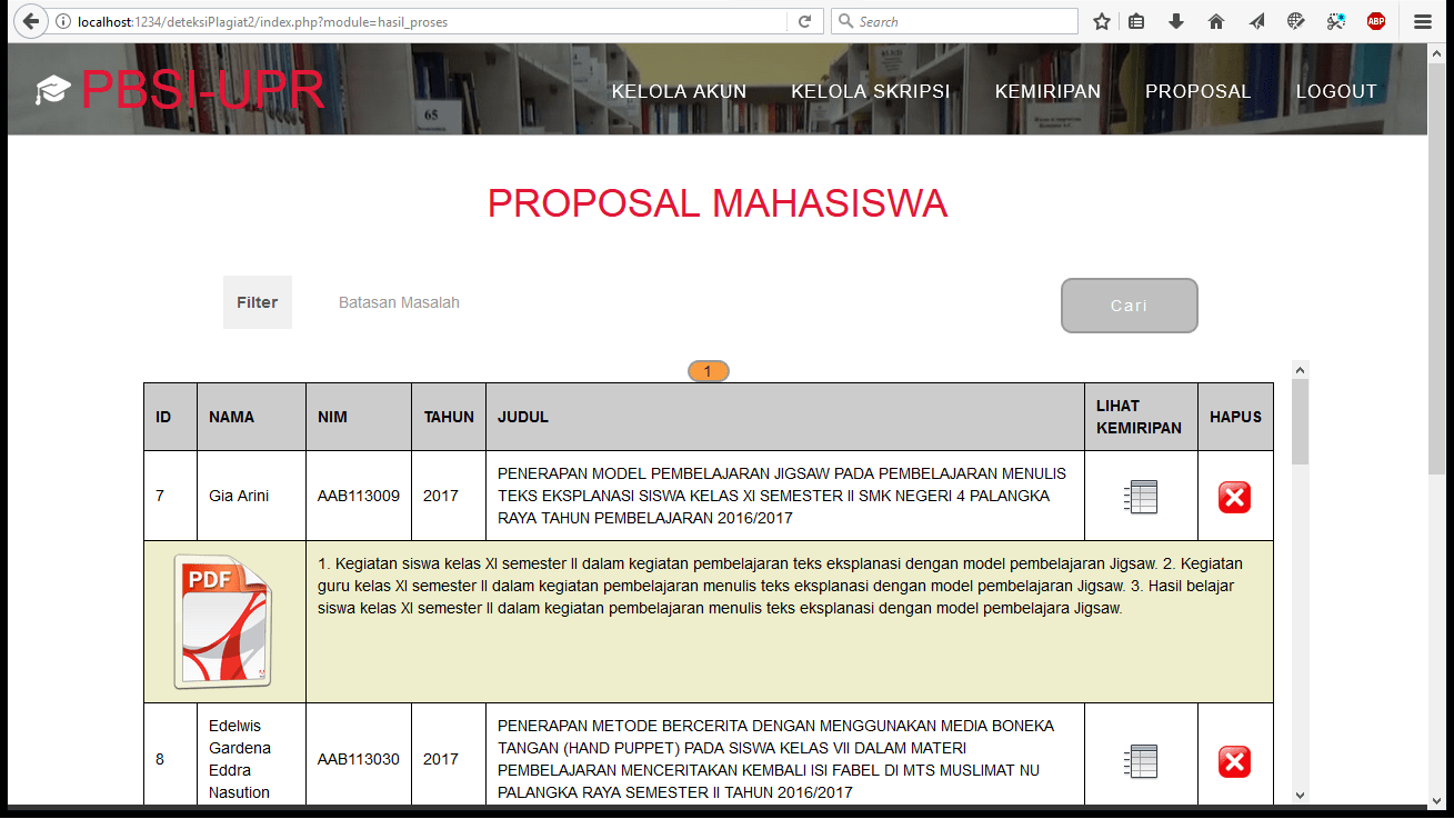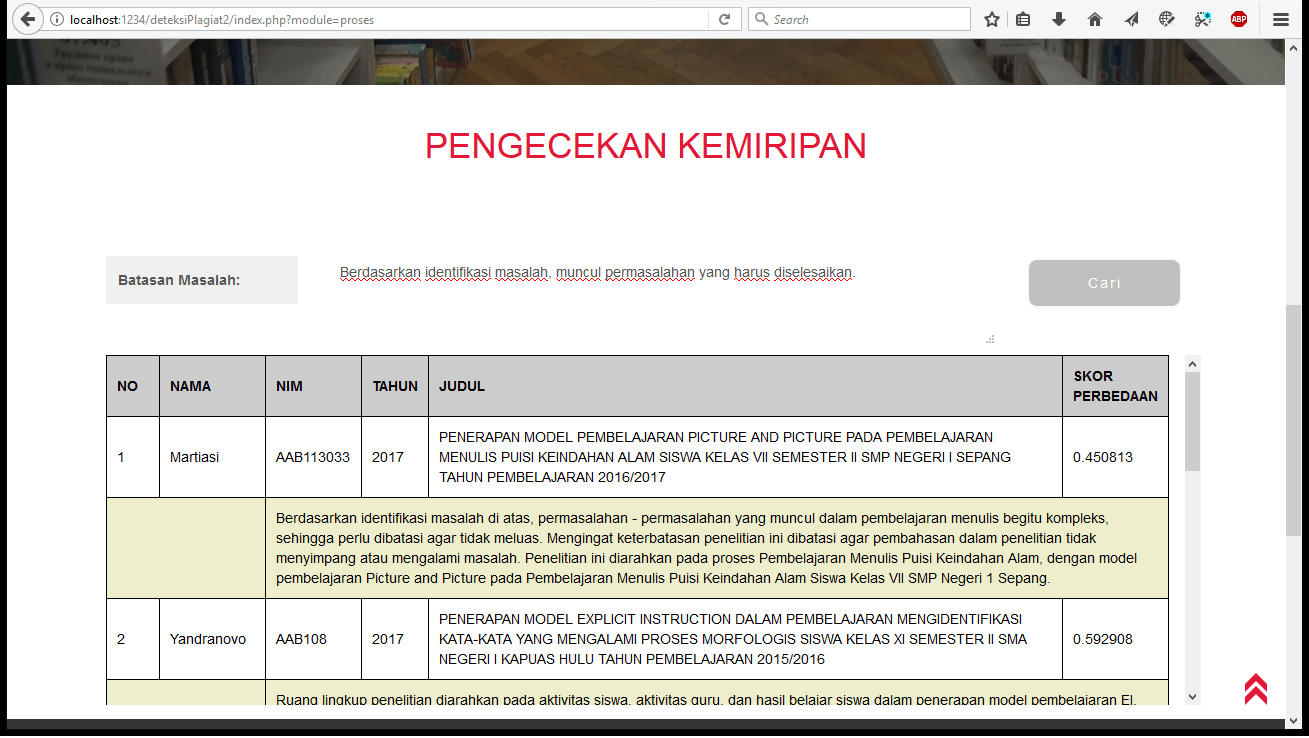 Fungsi utama aplikasi ini adalah melakukan pendeteksian plagiat terhadap data yang sudah tersedia pada database.