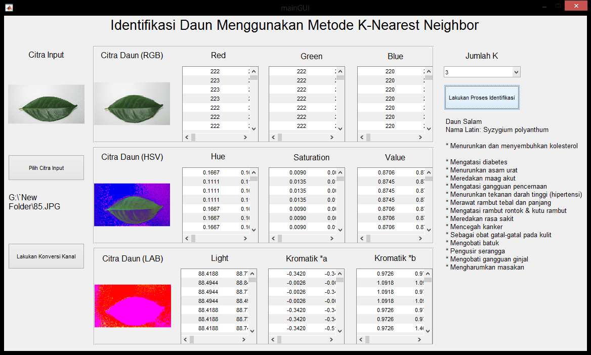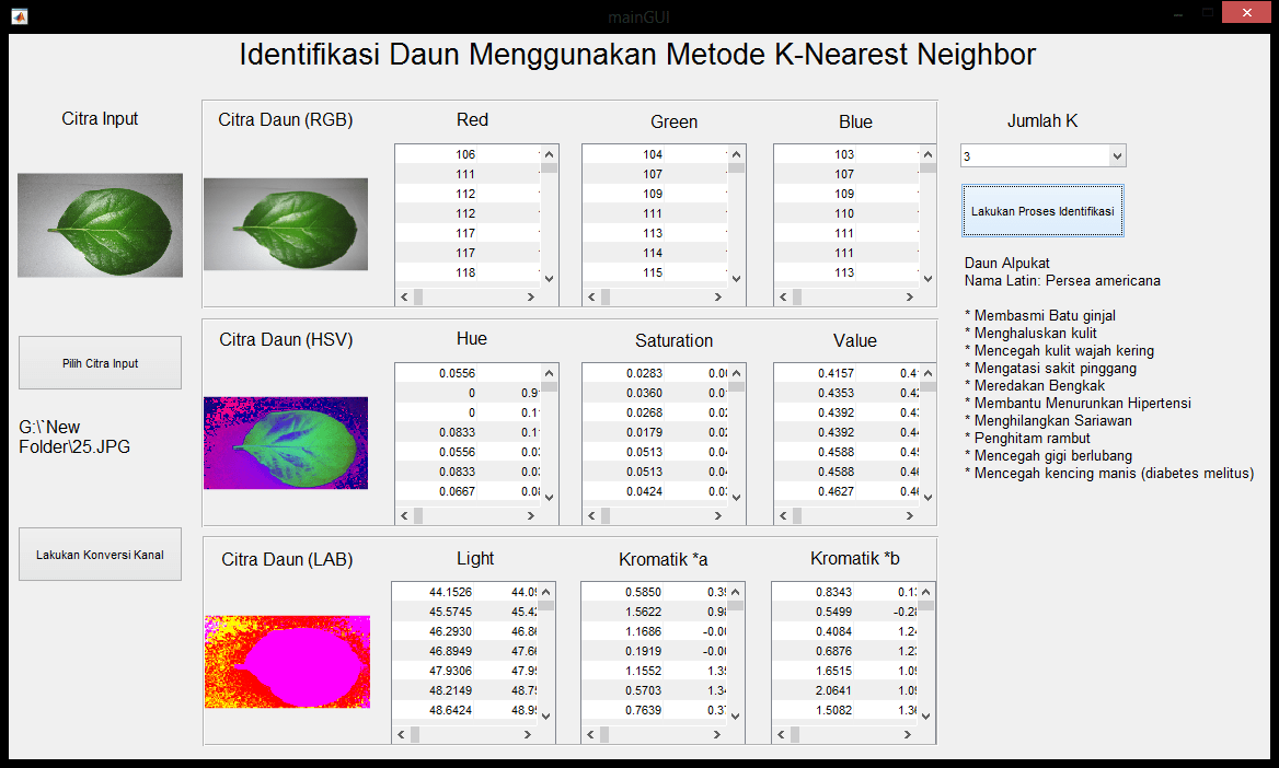 | Terdapat 2 macam daun yang dijadikan sebagai data input, yaitu daun salam dan daun alpukat. Masing-masing citra dari daun salam dan daun alpukat kemudian akan dicari nilai fitur berdasarkan konversi warna dari komponen warna RGB (Red, Green, Blue) menjadi HSV (Hue, Saturation, Value) dan Lab (Light, Kromatik *a, Kromatik *b). Citra input kemudian juga akan melalui hal yang sama, dan kemudian nilainya akan dibandingkan dengan masing-masing citra daun yang tersedia. Setelah melakukan proses perbandingan dan mendapatkan jawaban jenis daun, keterangan berupa nama daun, nama latin, dan kegunaan daun tersebut akan ditampilkan pada layar. Metode yang digunakan adalah metode k-NN (k-Nearest Neighbors). Tutorial dari masing-masing metode dapat dilihat pada link diatas. | |