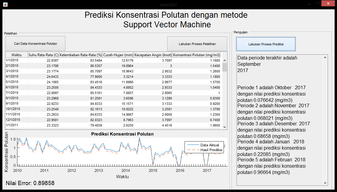 | Fungsi utama aplikasi ini adalah untuk melakukan uji akurasi terhadap data konsentrasi polutan yang tersedia. Sistem akan melakukan pelatihan sistem support vector berdasarkan data latih, dan kemudian melakukan pengujian nilai prediksi terhadap masing-masing data tersebut. Hasil perbandingan antara data sebenarnya dengan nilai prediksi kemudian akan ditampilkan dalam grafik. Setelah itu, sistem dapat digunakan untuk memprediksikan 5 data konsentrasi polutan pada periode berikutnya. Metode yang digunakan adalah metode SVR (Support Vector Regression). Tutorial dari metode SVR dapat dilihat pada link diatas. | |