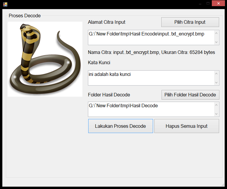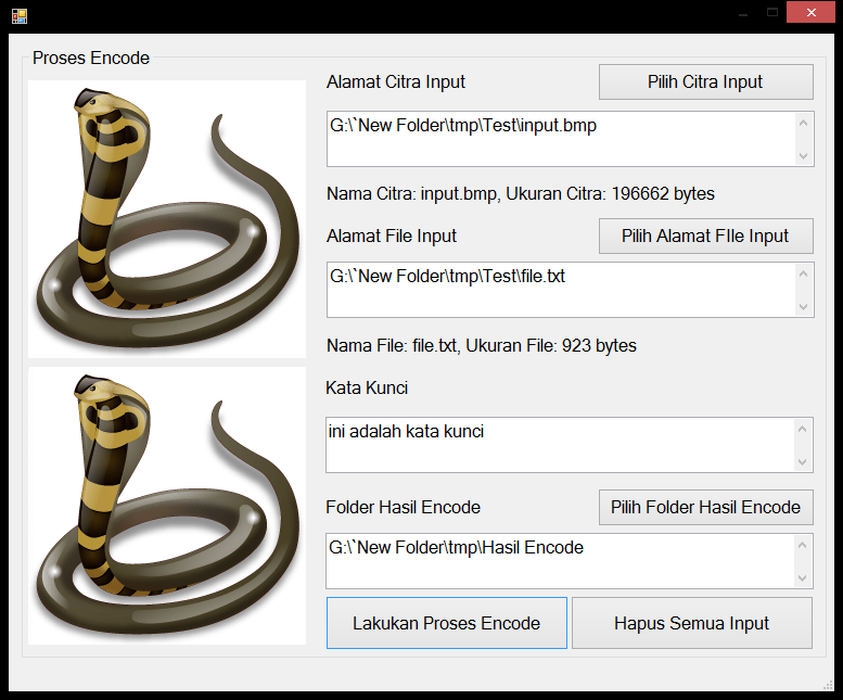 | Fungsi utama dari aplikasi ini adalah untuk melakukan enkripsi berbagai macam tipe file, dan kemudian hasilnya akan disisipkan ke dalam sebuah citra bertipe bmp. Citra yang diberi sisipan tidak boleh mengalami kerusakan citra sehingga tetap dapat dilihat seperti biasa. Proses selanjutnya adalah proses ekstraksi, dimana file terenkrip akan diekstrak dari citra, dan kemudian dilakukan dekripsi agar kembali menjadi seperti semula. Hasil file ini harus dapat dilihat kembali sama seperti bentuk aslinya. Metode enkripsi yang digunakan adalah metode Serpent, sedangkan metode penyisipan citra yang digunakan adalah metode LSB (Least Significant Bit). Tutorial metode ini dapat dilihat pada link diatas. | |