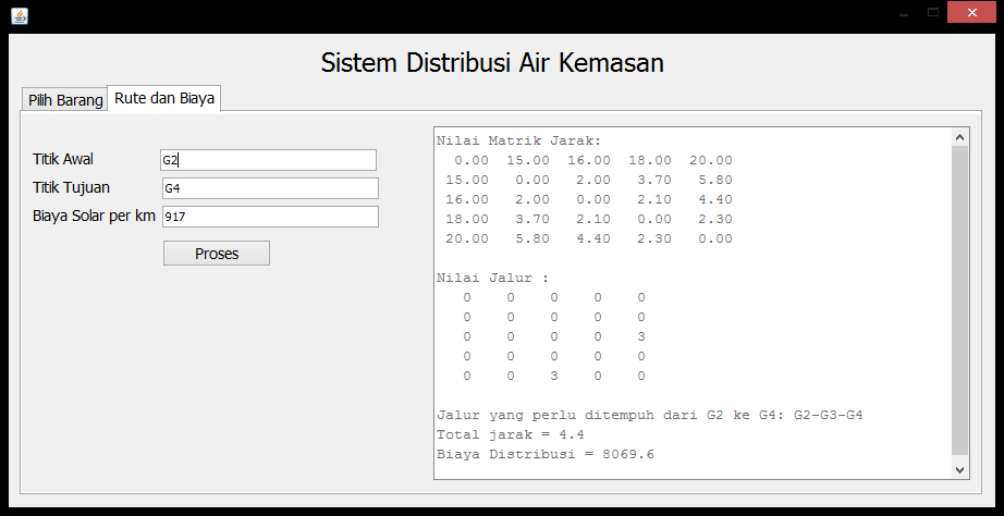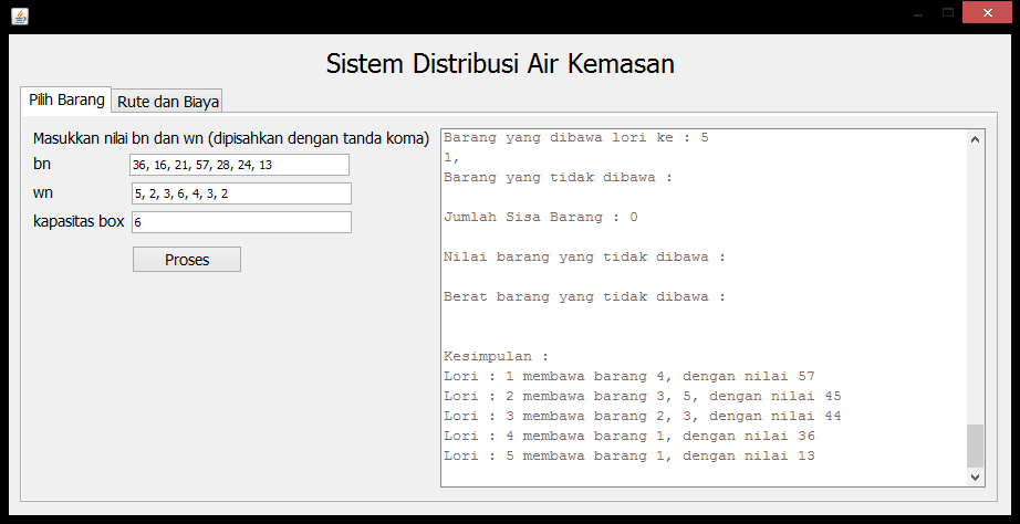 | Fungsi utama aplikasi ini terbagi dalam 2 macam, yaitu bagaimanakah cara memaksimalkan barang yang dibawa oleh masing-masing lori, dan bagaimanakah rute yang harus ditempuh untuk meminimalkan biaya perjalanan dari lori tersebut. Penyelesaian permasalahan pertama dilakukan dengan teknik Knapsack 0/1, sedangkan penyelesaian permasalahan kedua dilakukan dengan algoritma Floyd Warshall. Akan tetapi, kedua proses ini tidak saling berhubungan sehingga pengguna dapat melakukan pencarian rute tanpa harus menghitung lori yang diperlukan dari proses pertama. | |