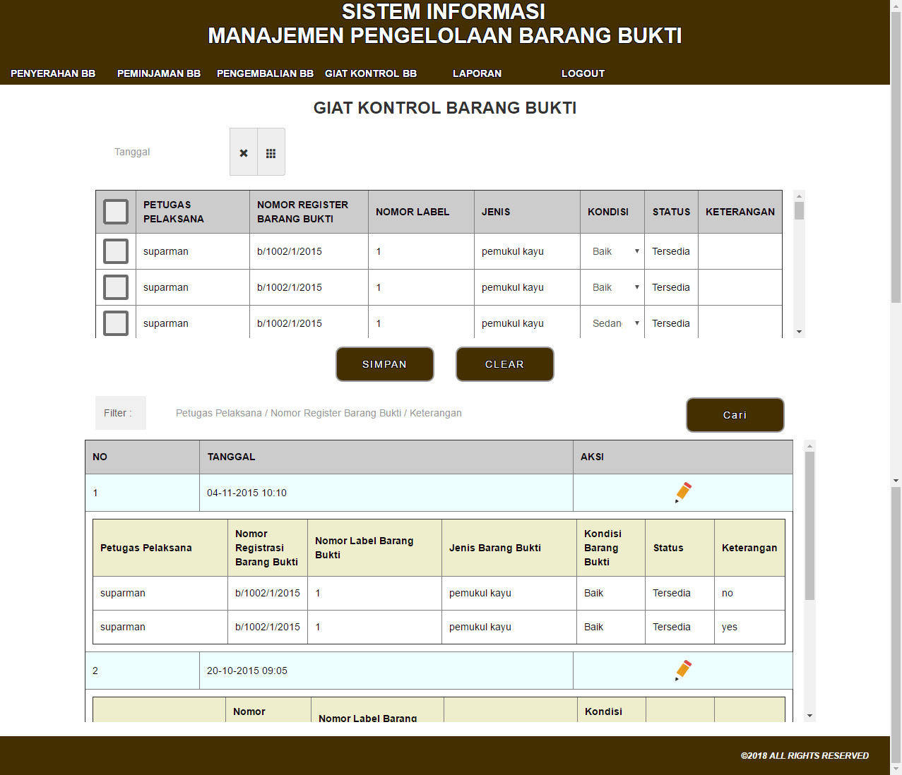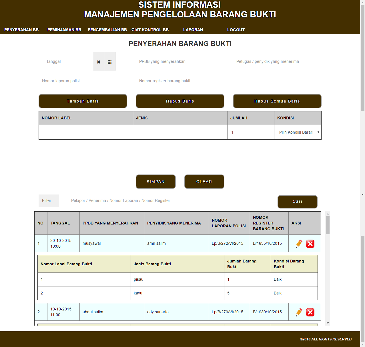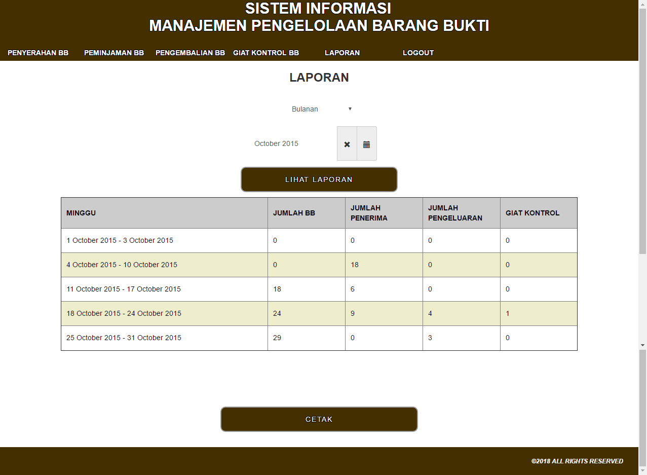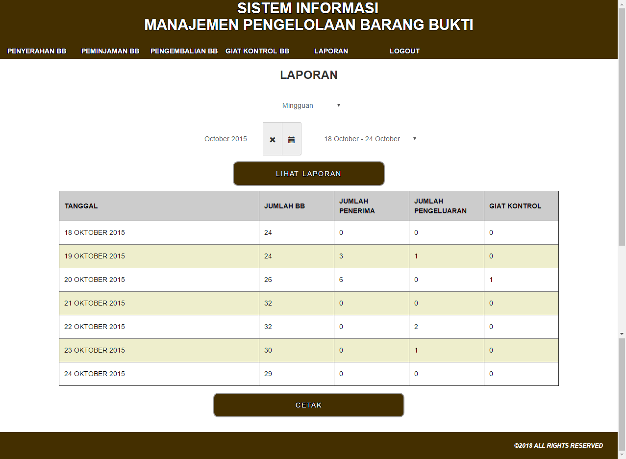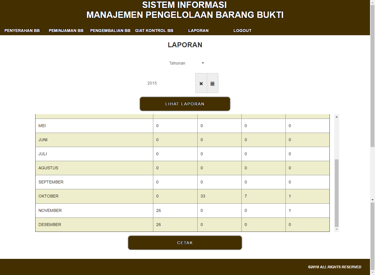 | Fungsi utama aplikasi ini adalah hanya untuk melakukan pencatatan penyimpanan dan pengeluaran barang bukti secara digital. Ada 3 fitur utama yang dibutuhkan dalam aplikasi. Halaman penyerahan digunakan untuk menambahkan barang bukti ke dalam sistem, halaman peminjaman dan pengembalian digunakan untuk transaksi yang terjadi untuk masing-masing barang bukti, dan kemudian halaman giat kontrol digunakan sebagai kontrol berkala untuk pengecekan kondisi dari masing-masing barang bukti yang tersimpan dalam sistem. Untuk masing-masing proses diatas juga tersedia laporan yang dapat dipilih secara mingguan, bulanan, atau tahunan untuk mengetahui transaksi apa sajakah yang terjadi selama periode waktu tersebut. | |