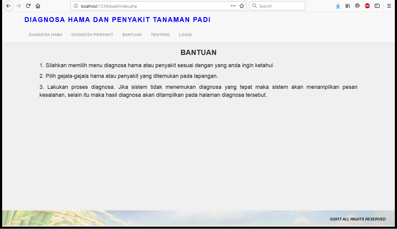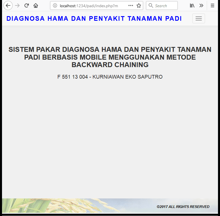 | Fungsi utama aplikasi ini adalah untuk melakukan diagnosa hama dan diagnosa penyakit dari tanaman padi. Oleh sebab itu diperlukan data gejala, solusi, dan aturan untuk masing-masing hama dan penyakit tanaman padi. Pada saat proses diagnosa, pengguna akan memilih gejala mana sajakah yang dialami oleh tanaman padi, dan kemudian sistem akan melakukan proses perhitungan untuk mencari hasil diagnosa beserta solusi yang dapat digunakan untuk mengatasi hama atau penyakit tersebut. Metode yang digunakan adalah metode Backward Chaining. Tutorial metode ini dapat dilihat pada link diatas. | |