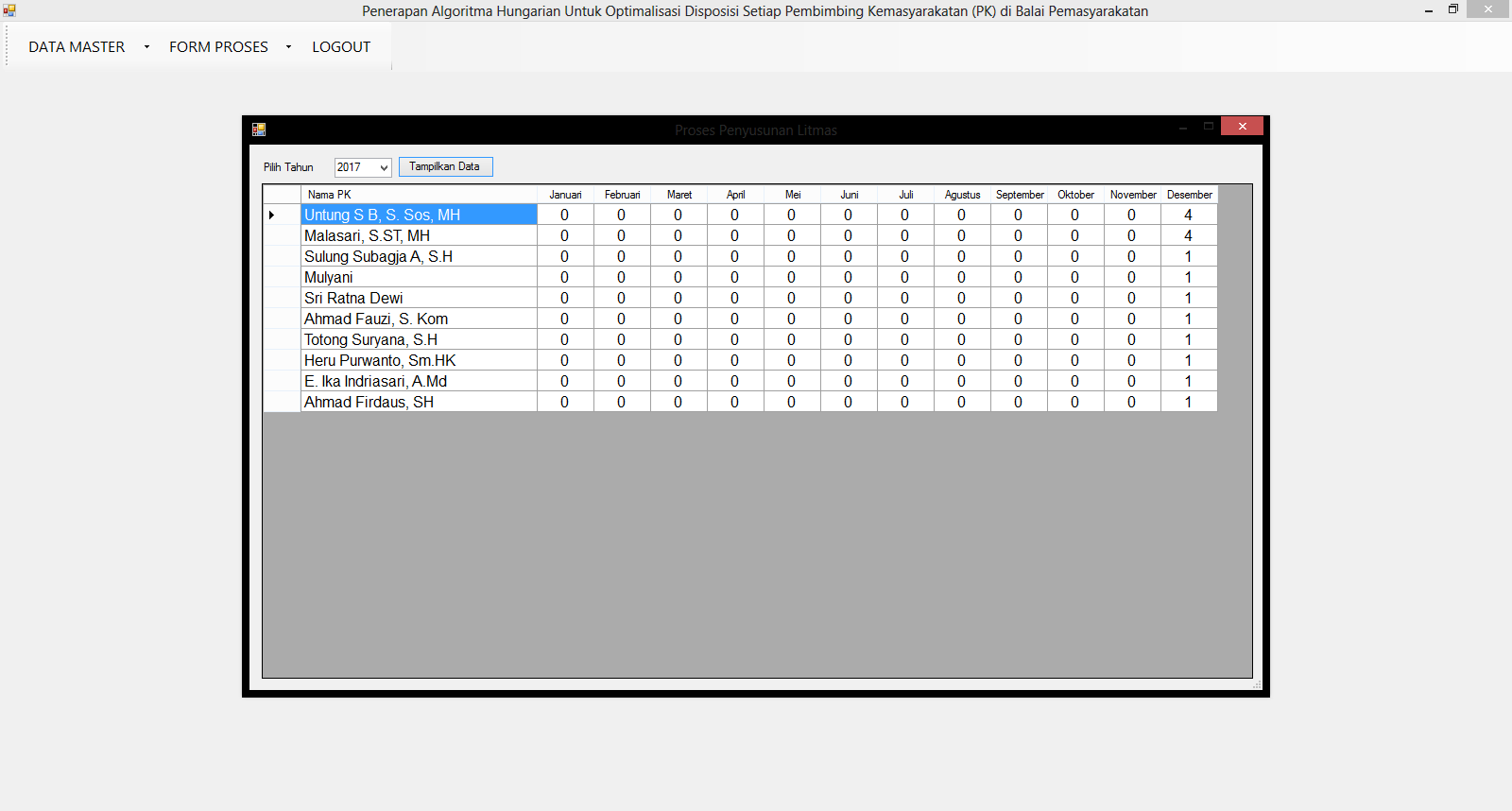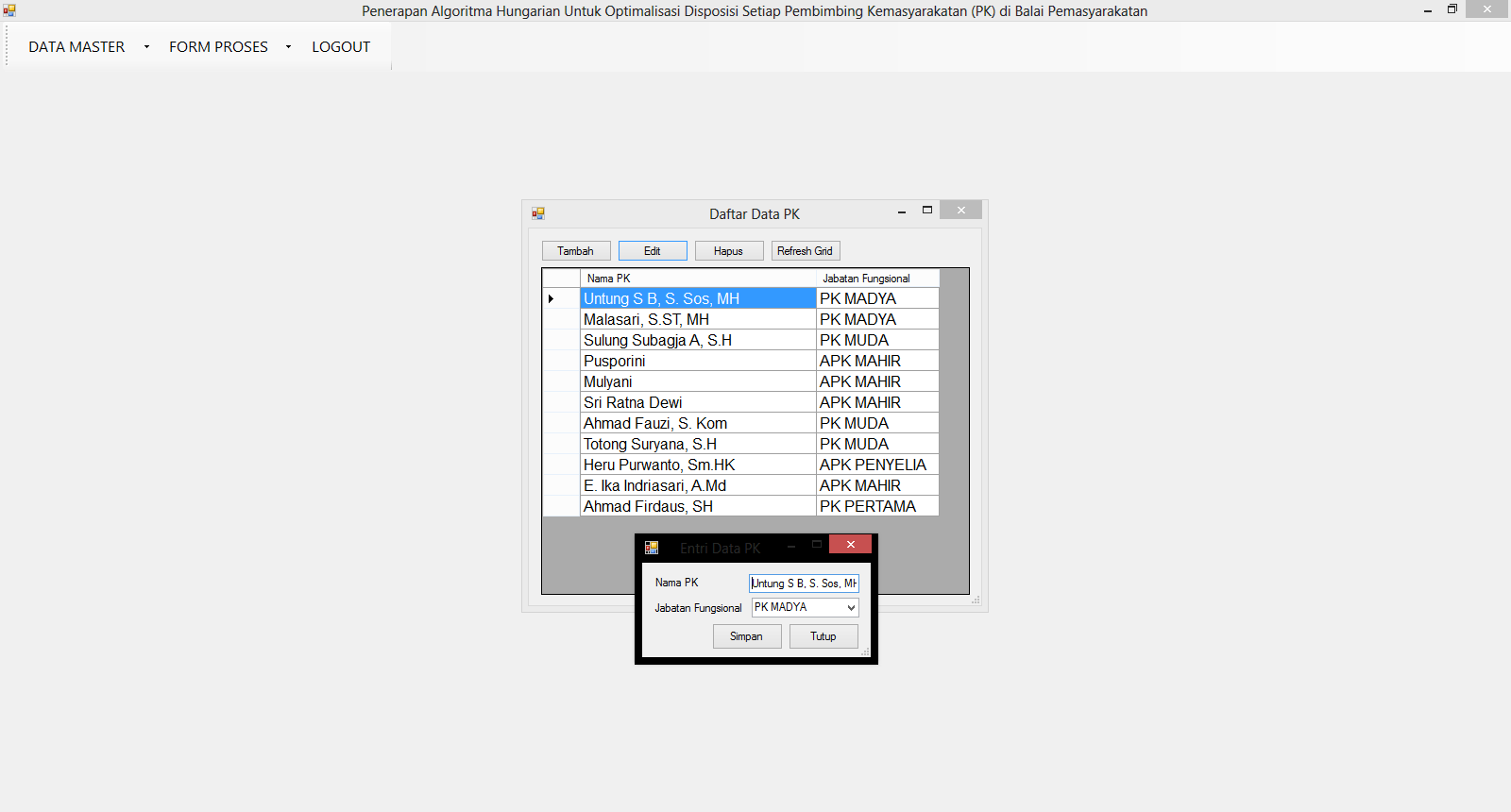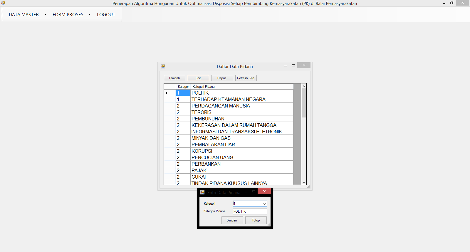 | Fungsi utama dari aplikasi ini adalah untuk mencari sistem penugasan petugas sehingga semua petugas mendapatkan pekerjaan yang seimbang. Terdapat 3 data yang digunakan yaitu data petugas, data lembaga pemasyarakatan (lapas), dan data jenis kasus pidana. Kemudian masing-masing petugas akan memiliki tingkat keahlian untuk mengerjakan setiap masing-masing kasus pidana dengan rentang tertentu. Pengguna akan mengisi data klien dari masing-masing lapas dan mengumpulkannya dalam waktu 1 minggu, dan kemudian pada minggu berikutnya sistem akan melakukan perhitungan untuk mencari sistem penugasan terbaik sehingga petugas dapat mengunjungi semua klien dengan jenis kasus pidana yang lebih dikuasai. Metode yang digunakan adalah metode Kuhn-Munkres / Hungaria. Tutorial metode ini dapat dilihat pada link diatas. | |