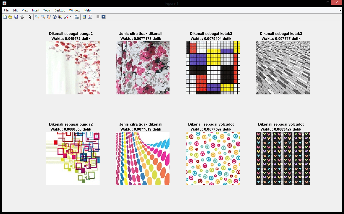 | Fungsi utama aplikasi ini adalah untuk melakukan klasifikasi terhadap 3 buah jenis tekstur, yaitu tekstur bunga-bunga, kotak-kotak, dan volcadot. Data yang digunakan adalah sejumlah data citra dari masing-masing jenis tekstur tersebut. Karena program tidak memiliki desain GUI, maka proses pelatihan dan pengujian dilakukan dengan menggunakan file terpisah. Proses pelatihan membutuhkan pembacaan input folder yang berisi semua citra sesuai dari masing-masing jenis dan menghasilkan obyek SVM, sedangkan proses pengujian membutuhkan obyek SVM dan input citra yang diuji. Hasil pengujian ditampilkan dalam figure beserta jenis tekstur dan waktu pengujian. Metode yang digunakan adalah metode Gabor Filter dan SVR (Support Vector Regression). Tutorial metode ini dapat dilihat pada link diatas. | |
