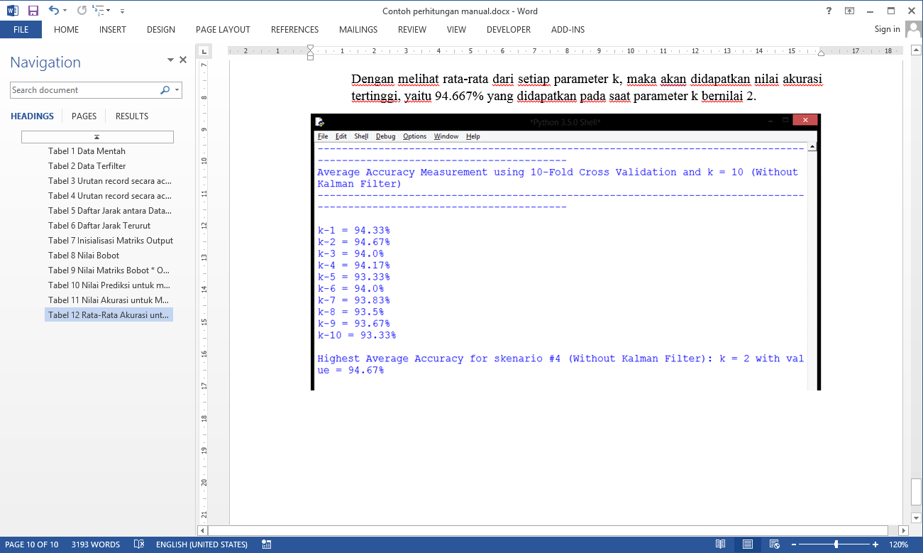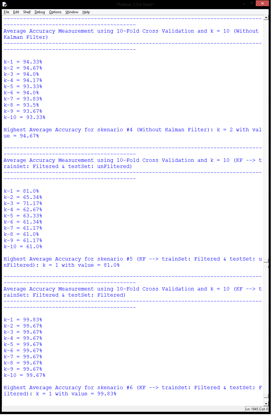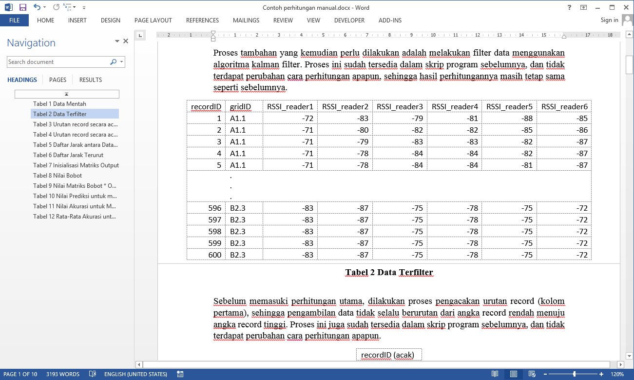 | Proyek ini hanya dikerjakan dalam 3 hari karena hanya merupakan improvisasi dari contoh skrip yang telah tersedia. Fungsi utama aplikasi ini adalah untuk melakukan pengujian akurasi terhadap data yang tersedia. Data yang digunakan adalah data hasil pembacaan card BLE (Bluetooth Low Energy) yang dibaca dengan 6 reader berbeda sebanyak beberapa kali. Data ini kemudian diuji sebanyak 3 kali dengan algoritma Fuzzy k-NN untuk 3 macam cara filter, yaitu tanpa menggunakan Kalman Filter, hanya menggunakan Kalman Filter untuk data latih, dan yang terakhir adalah menggunakan Kalman Filter baik untuk data latih maupun data uji. Metode yang digunakan adalah metode Fuzzy k-NN. Tutorial metode ini dapat dilihat pada link diatas. Sebenarnya pada skrip contoh sudah tersedia perhitungan dengan algoritma k-NN yang menggunakan teknik k-Fold Cross Validation, beserta sistem filter dengan Kalman Filter. | |