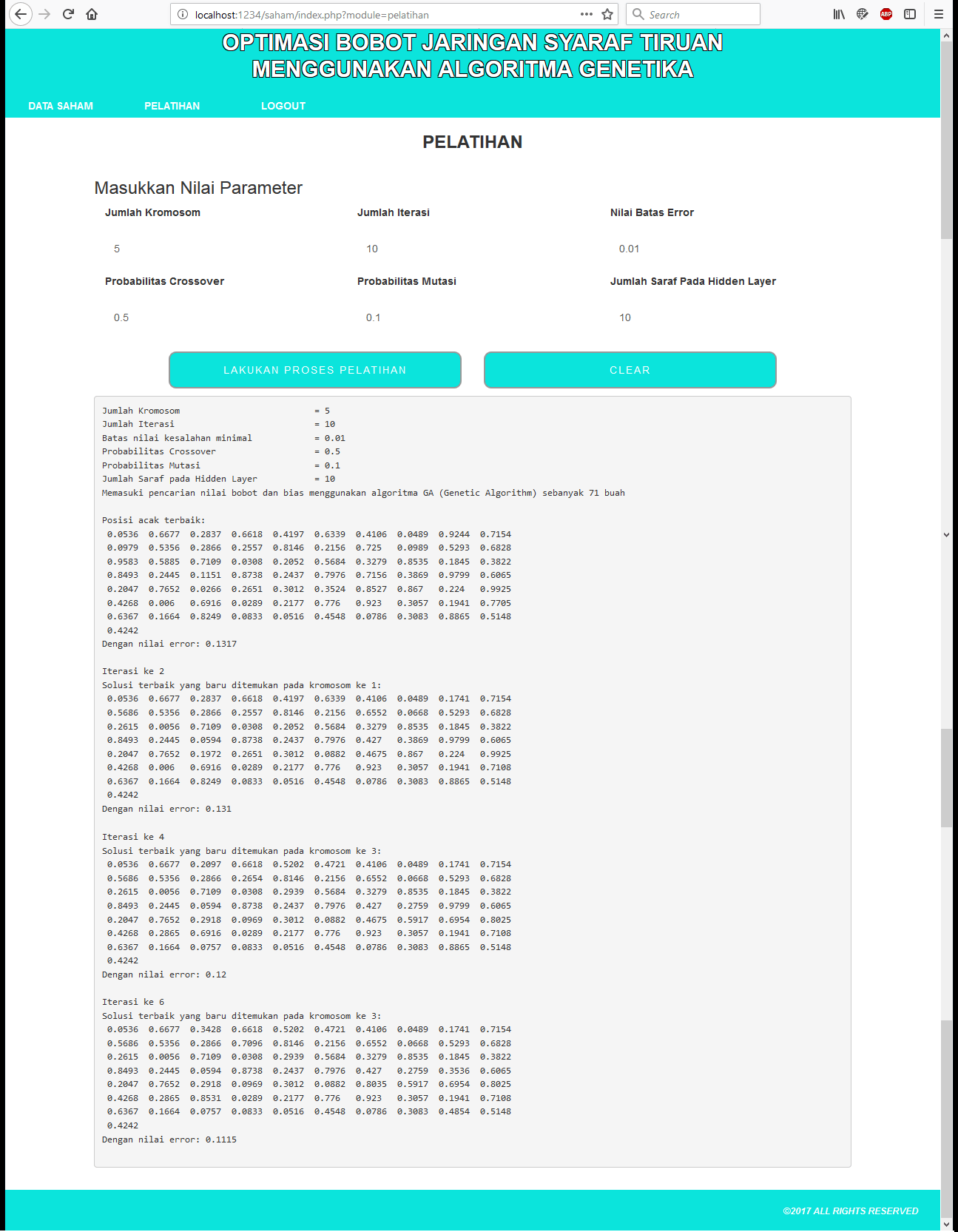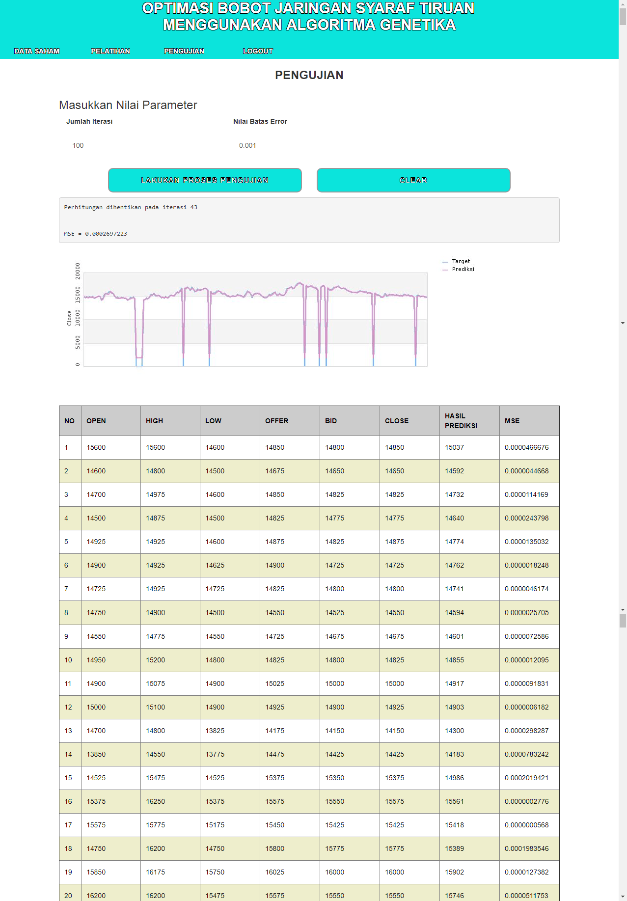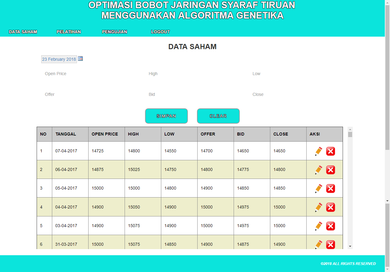 | Fungsi utama aplikasi ini adalah untuk melakukan pengujian prediksi untuk harga penutupan saham. Data yang digunakan adalah data saham dengan 5 kriteria input yaitu Open, High, Low, Offer, dan Bid, dan 1 kriteria output yaitu Close. Sistem akan melakukan pelatihan bobot menggunakan Algoritma Genetika, dan kemudian bobot tersebut akan dipakai kembali dalam proses pengujian dengan menggunakan Algoritma Backpropagation. Hasil perhitungan adalah nilai prediksi untuk kriteria Close dari masing-masing data yang digunakan. Metode yang digunakan adalah metode Backpropagation dan Algoritma Genetika. Tutorial metode ini dapat dilihat pada link diatas. | |