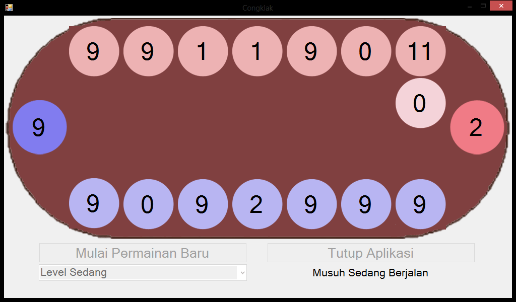 | Ini adalah aplikasi permainan untuk bermain congklak. Aturan-aturan yang digunakan juga sama seperti aturan pada umumnya. Pemain akan mengambil biji congklak dari salah satu lubang pemain, kemudian secara bergiliran akan bergerak searah jarum jam untuk meletakkan biji congklak pada lubang-lubang berikutnya sampai biji congklak ditangan sudah habis. Jika pada lubang terakhir masih terdapat biji congklak maka pemain akan mengambil biji congklak tersebut dan melakukan hal yang sama seperti diatas. Hal tersebut berulang sampai biji terakhir terletak di lubang yang kosong, kemudian permainan dilanjutkan oleh musuh. Musuh juga akan melakukan hal yang sama sampai kondisi berhenti tercapai, kemudian permainan beralih kepada pemain. Pemenang permainan adalah pemain dengan jumlah biji pada lubang besar paling banyak. Metode yang digunakan adalah metode Greedy Algorithm. | |