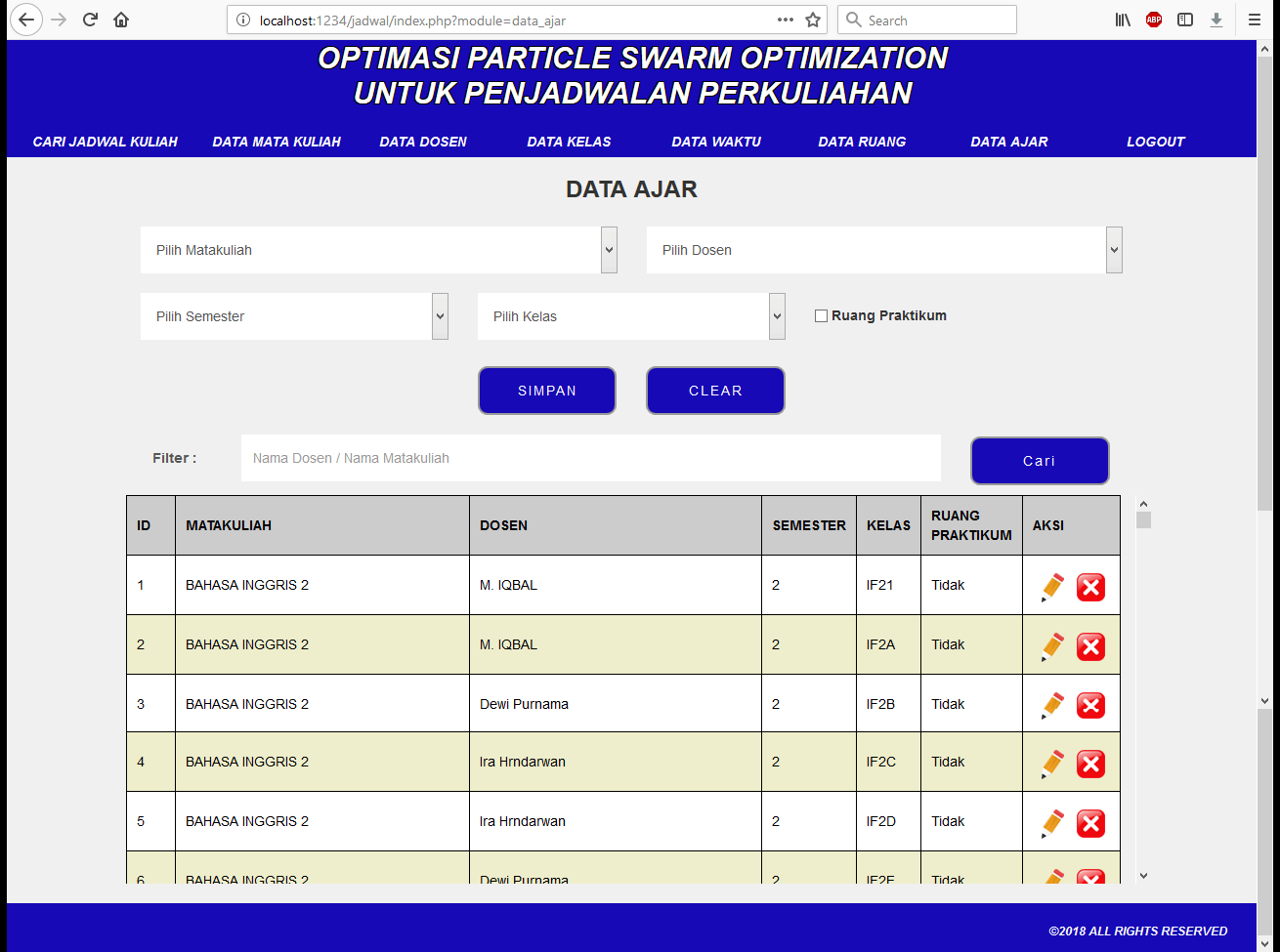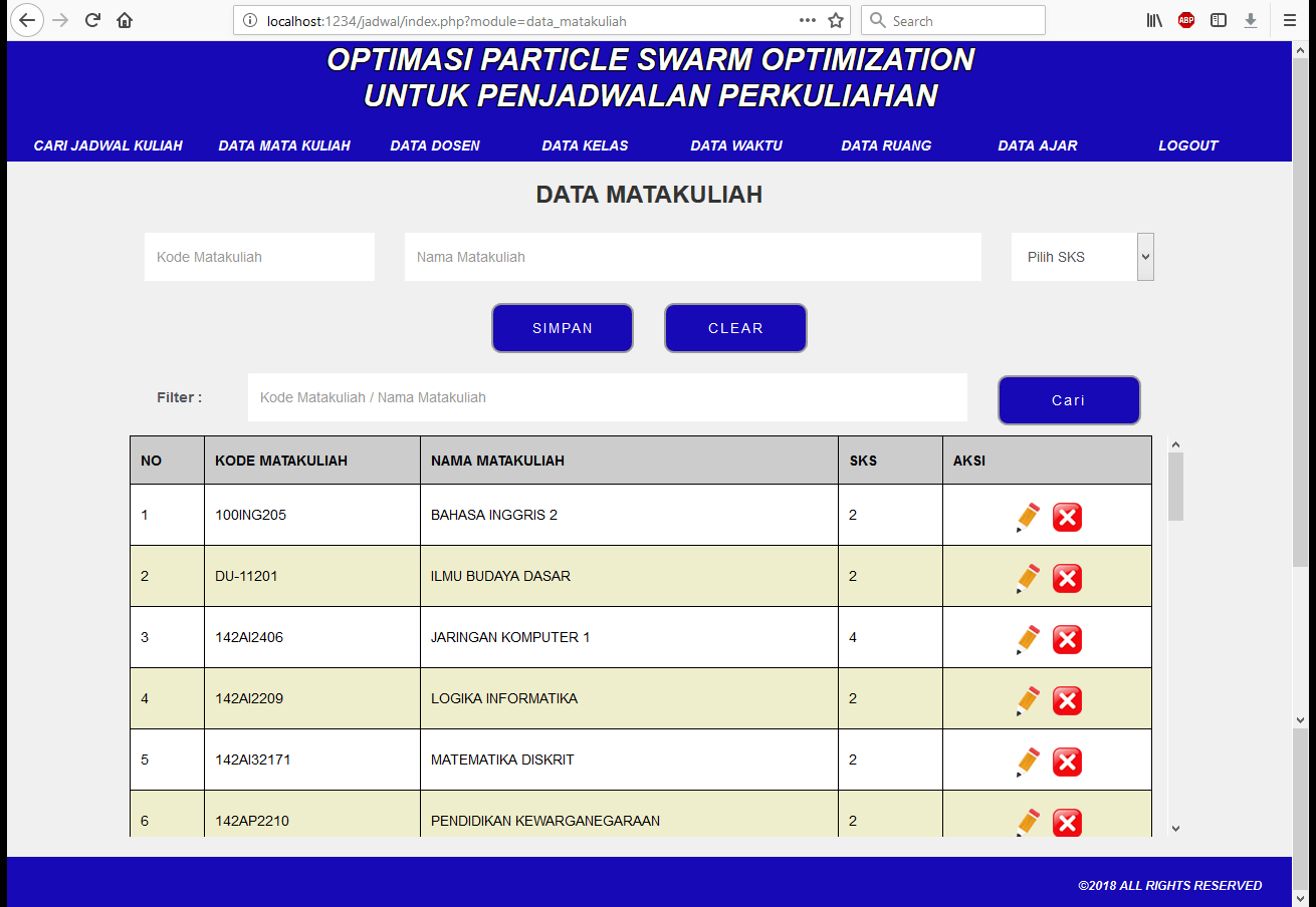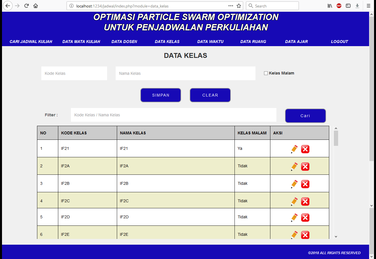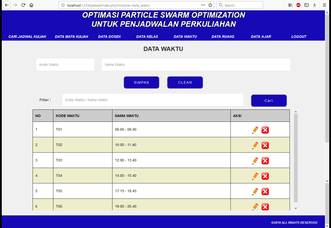 | Ada sejumlah inputan data mata kuliah, dosen, kelas, waktu, ruang, dan tabel ajar yang tersedia. Data-data ini kemudian akan diproses untuk memperoleh jadwal kuliah yang paling baik. Jadwal kuliah yang tersedia memiliki batasan bahwa pada hari dan jam yang sama, tidak boleh ada matakuliah, dosen, dan ruang yang berada pada saat bersamaan. Selain itu terdapat beberapa batasan khusus dari segi sks, kode kelas, dan slot waktu yang harus dipenuhi agar tidak menghasilkan jadwal perkuliahan yang bentrok. Metode yang digunakan adalah metode PSO (Particle Swarm Optimization). Tutorial metode ini dapat dilihat pada link diatas. | |