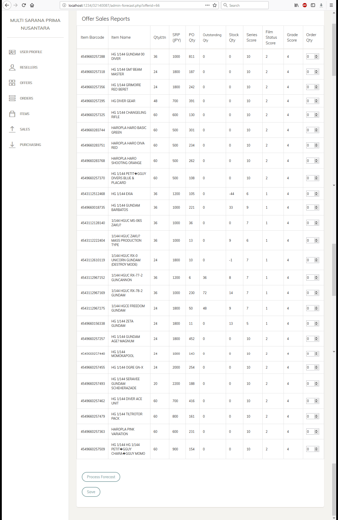 | Fungsi utama aplikasi ini adalah untuk melakukan perkiraan jumlah order dengan menggunakan data offer / permintaan dari periode sebelumnya. Data offer tersebut memiliki beberapa kriteria seperti PO Qty, Outstanding Qty, Stock Qty, Series Score, Film Status Score, dan Grade Score, dan memiliki sebuah kolom Order Qty sebagai output. Pada saat proses prediksi, pengguna akan memilih terlebih dahulu data offer manakah yang akan diprediksi outputnya, kemudian sistem akan mengambil semua data pada offer-offer sebelumnya sebagai data latih, melakukan pelatihan bobot, dan kemudian memprediksi nilai output berupa Order Qty dari masing-masing data offer tersebut. Data kolom Order Qty kemudian dapat disimpan ke dalam database agar dapat digunakan sebagai data latih untuk prediksi data offer pada periode-periode berikutnya. Metode yang digunakan adalah metode Backpropagation. Tutorial metode ini dapat dilihat pada link diatas. | |