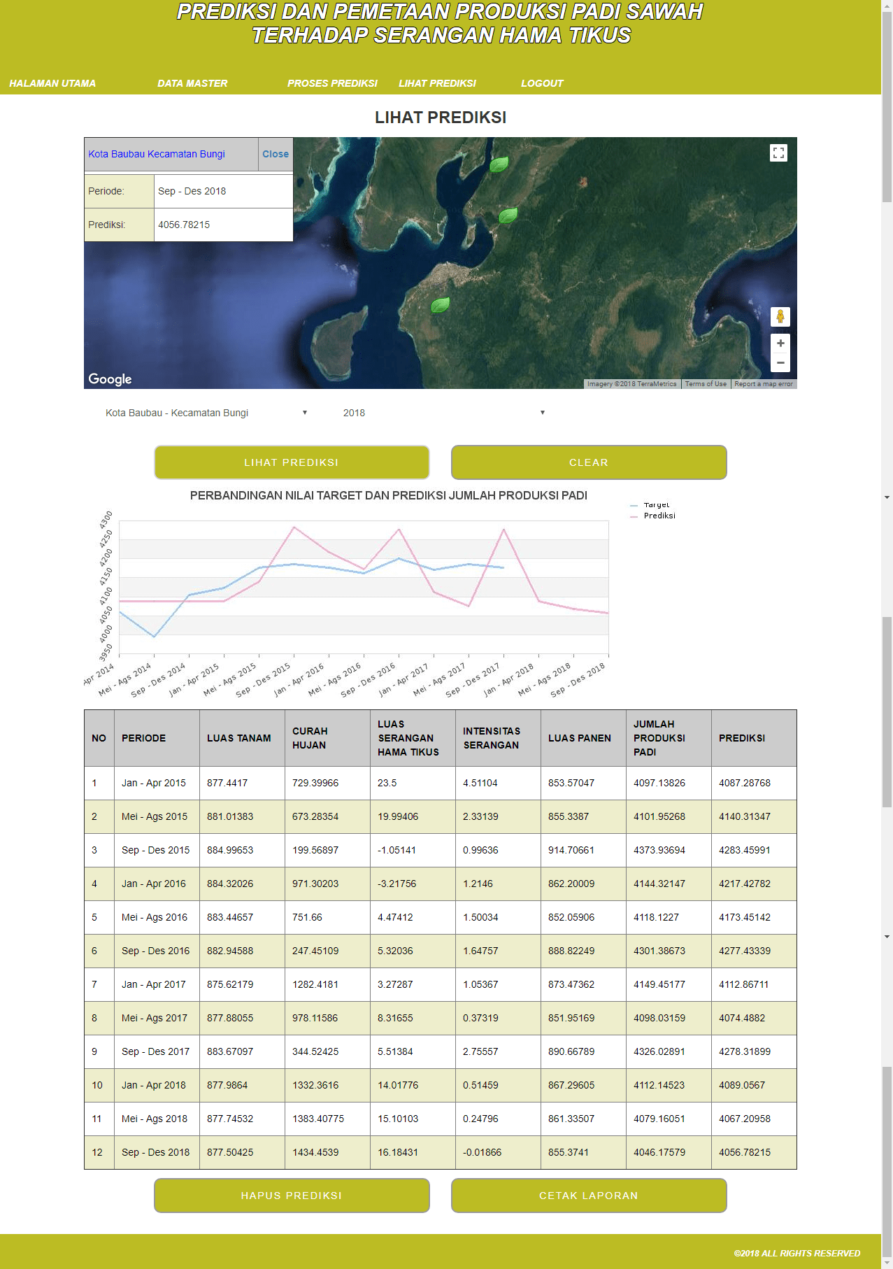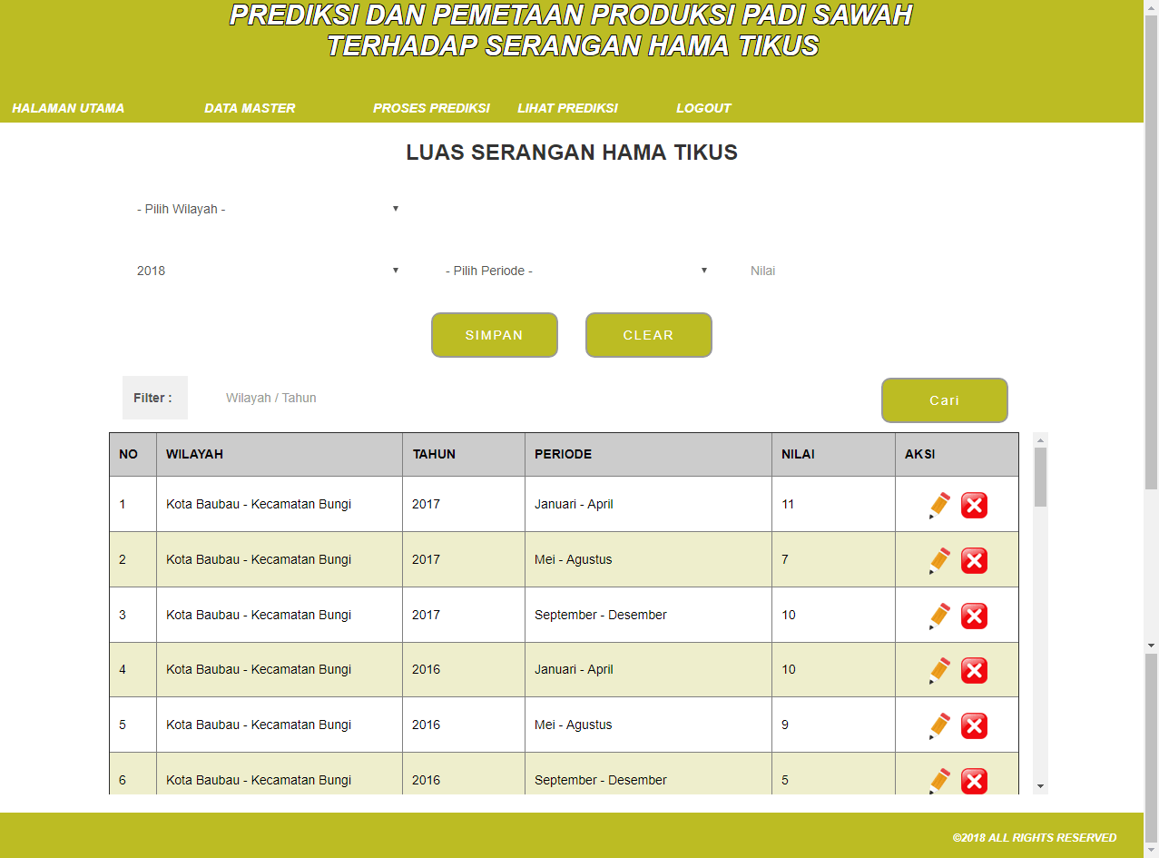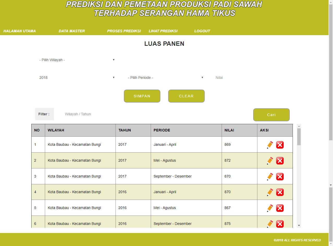 | Fungsi utama aplikasi ini adalah untuk melakukan perkiraan jumlah produksi padi, dengan kriteria-kriteria yang digunakan sebagai input adalah Luas Tanam, Curah Hujan, Luas Serangan Hama Tikus, Intensitas Serangan, dan Luas Panen. Selain itu juga terdapat data wilayah untuk mencatat nilai kriteria input diatas pada masing-masing wilayah. Pada saat melakukan prediksi, sistem akan melakukan pelatihan terlebih dahulu dengan menggunakan data latih sesuai dengan parameter wilayah dan periode yang diinputkan. Tahap pelatihan pertama adalah menggunakan Holt Winters, dengan hasil berupa nilai prediksi untuk periode tertentu, kemudian data output ini akan dijadikan data latih untuk algoritma Backpropagation, dengan hasil adalah bobot pelatihan. NIlai bobot ini yang kemudian digunakan untuk memprediksikan jumlah produksi padi pada periode yang baru. Metode yang digunakan adalah metode Holt Winters dan Backpropagation. Tutorial metode ini dapat dilihat pada link diatas. | |