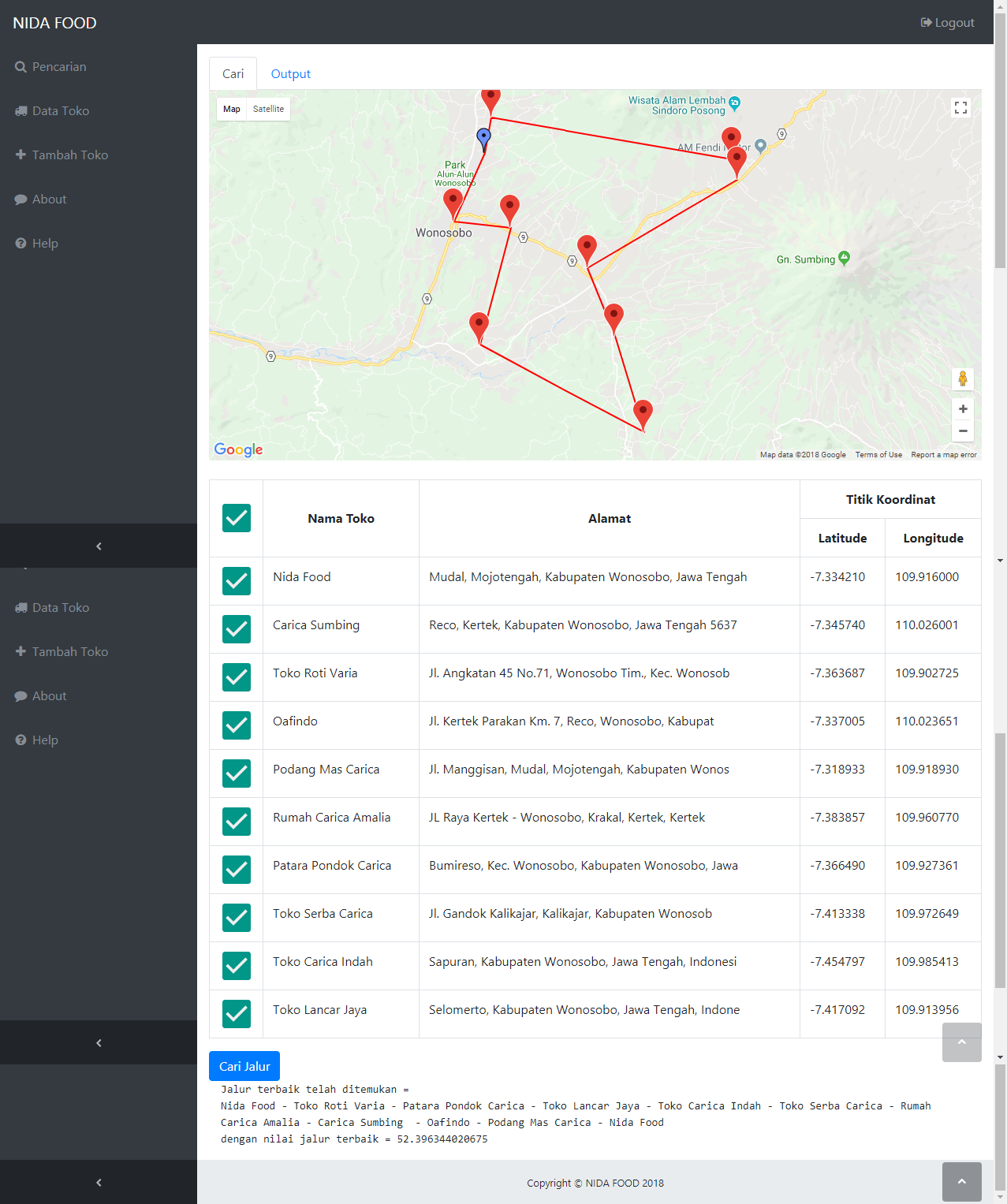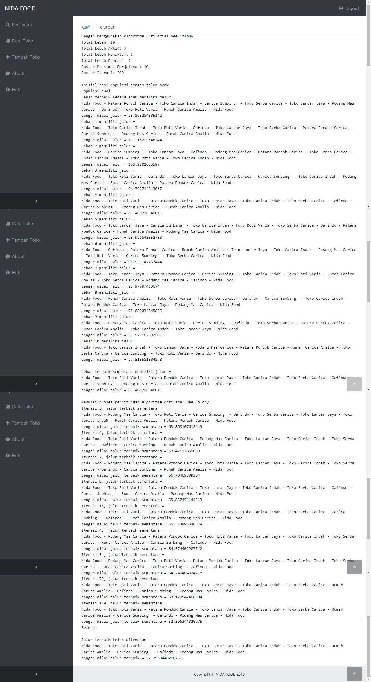 | Proyek ini hanya dikerjakan dalam 3 hari karena hanya meneruskan contoh skrip yang telah tersedia. Fungsi utama aplikasi ini adalah untuk melakukan pencarian jalur berdasarkan titik-titik yang dipilih. Pengguna akan memilih lokasi-lokasi distribusi yang ingin dituju, kemudian sistem akan melakukan pencarian jalur sehingga mendapatkan jalur dengan jarak yang paling pendek. Hasil pencarian jalur akan digambar pada peta, beserta dengan nilai jarak untuk melalui rute tersebut. Metode yang digunakan adalah metode BCO (Bee Colony Optimization). Tutorial metode ini dapat dilihat pada link diatas. | |