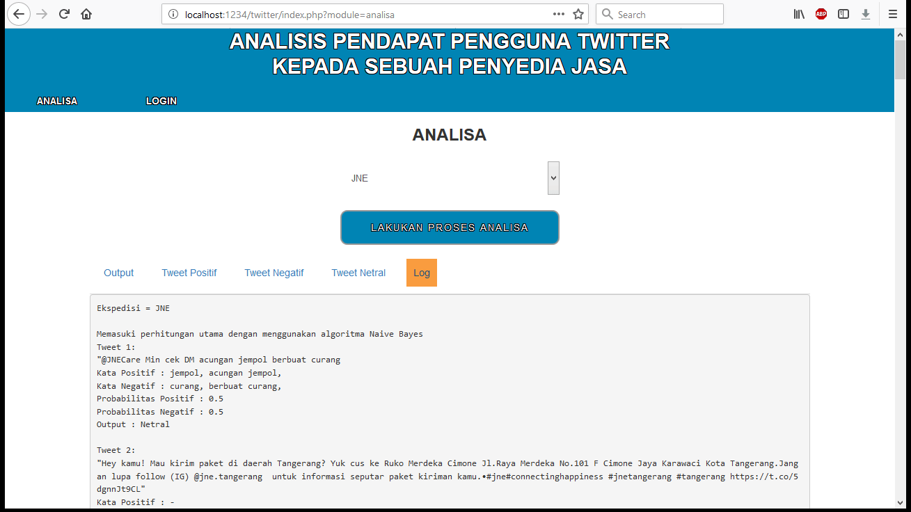 | Fungsi utama aplikasi ini adalah mengklasifikasikan tweet terhadap sebuah perusahaan penyedia jasa ekspedisi. Data yang digunakan adalah data tweet dari berbagai sumber yang sudah diekspor ke dalam bentuk file dokumen bertipe excel. Pada saat proses analisa, pengguna akan memilih sebuah jenis ekspedisi, dan kemudian sistem akan melakukan proses perhitungan untuk menentukan apakah data tweet terhadap ekspedisi tersebut memiliki kecenderungan positif, negatif, atau netral. Hasil kesimpulan akan ditampilkan pada layar, beserta dengan hasil pengelompokan masing-masing tweet terhadap status tersebut. Metode yang digunakan adalah metode N-Gram dan Naive Bayes. Tutorial metode ini dapat dilihat pada link diatas. | |