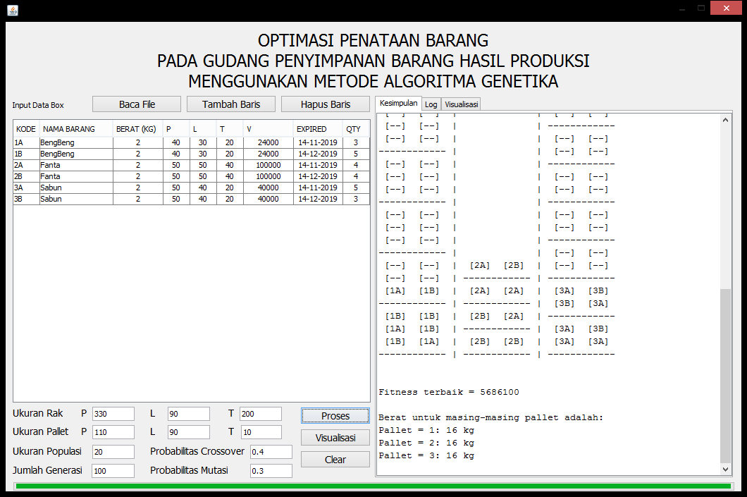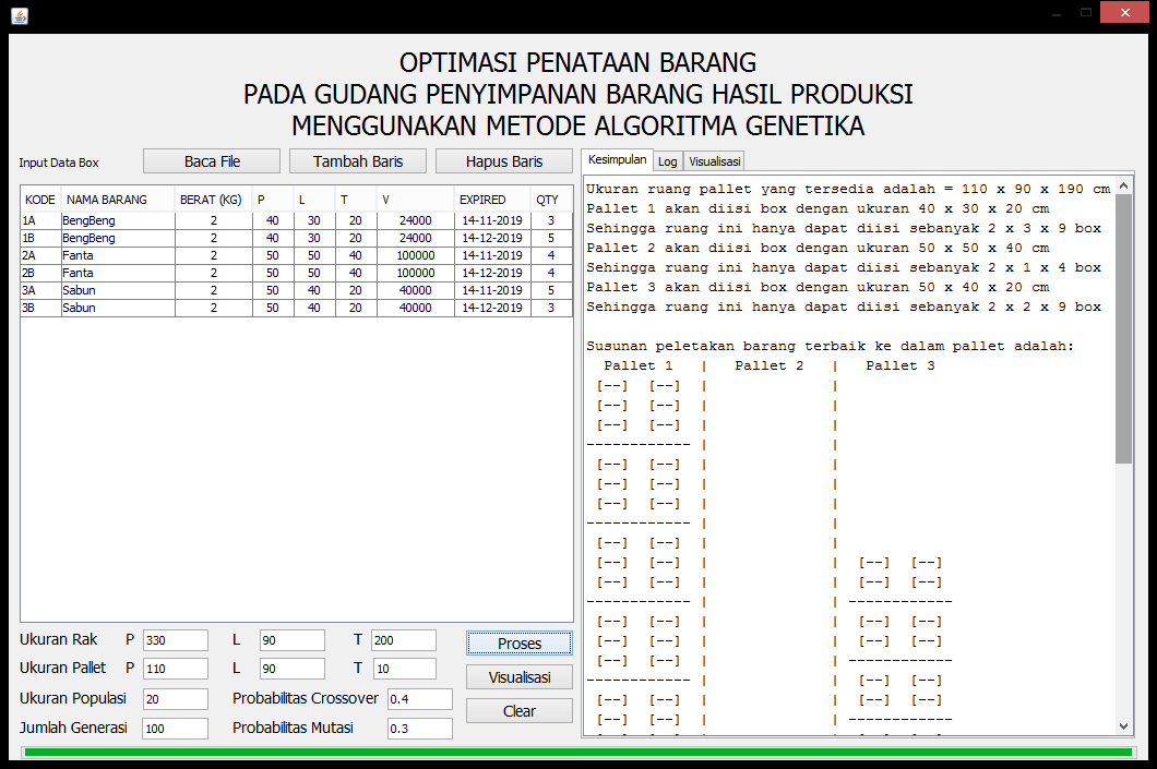 | Fungsi utama aplikasi ini adalah untuk melakukan penataan box barang ke dalam rak yang dapat dipisahkan oleh pallet apabila diperlukan. Input yang disediakan adalah ukuran rak, ukuran pallet, ukuran masing-masing box, jumlah masing-masing box, beserta parameter yang diperlukan oleh algoritma yang digunakan. Penataan barang tentunya harus memenuhi beberapa batasan tertentu seperti penataan barang dalam 1 pallet harus memiliki ukuran yang sama, penataan harus dimampatkan ke dalam rak dengan menggunakan jumlah pallet sesedikit mungkin, dan penyusunan box tidak boleh melebihi ukuran pallet. Hasil output yang ditampilkan adalah nilai fitness terbaik, total berat yang dibebankan kepada masing-masing pallet, dan isi dari variabel terbaik yang disimulasikan menjadi rancangan penyusunan box dalam pallet. Metode yang digunakan adalah metode GA (Genetic Algorithm) / Algoritma Genetika. Tutorial metode ini dapat dilihat pada link diatas. | |