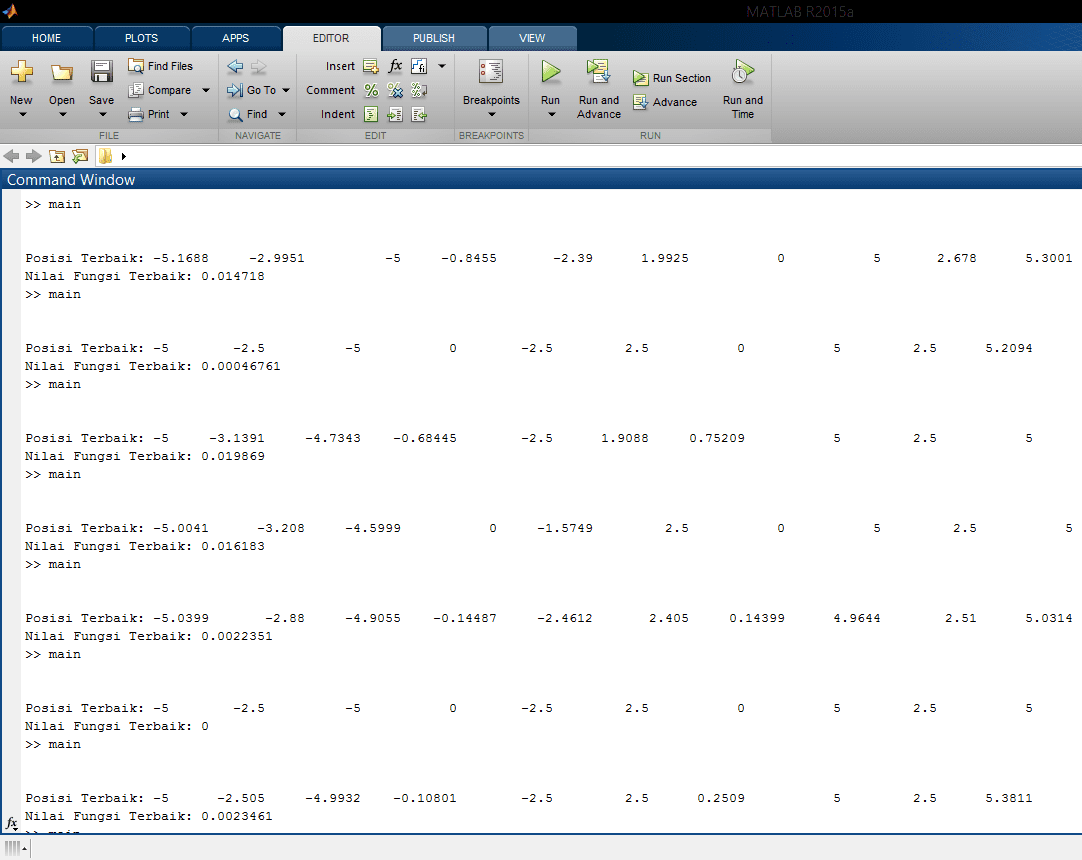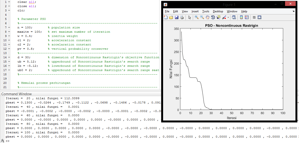 | Proyek ini hanya dikerjakan dalam 2 hari karena hanya merupakan contoh implementasi algoritma PSO (Particle Swarm Optimization) dengan modifikasi Crisscross. Program ini tidak memiliki tampilan GUI, dan tidak memiliki contoh kasus secara spesifik sehingga data yang digunakan adalah data acak. Skrip hanya bertujuan untuk mengimplementasikan modifikasi Crisscross pada algoritma PSO (Particle Swarm Optimization) dan kemudian menampilkan output posisi dan nilai fungsi terbaik yang ditemukan dalam periode tertentu. Setelah itu hasil perubahan nilai fungsi terhadap iterasi akan ditampilkan ke dalam bentuk grafik. | |