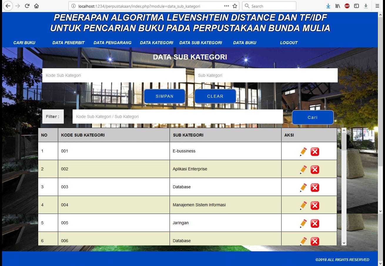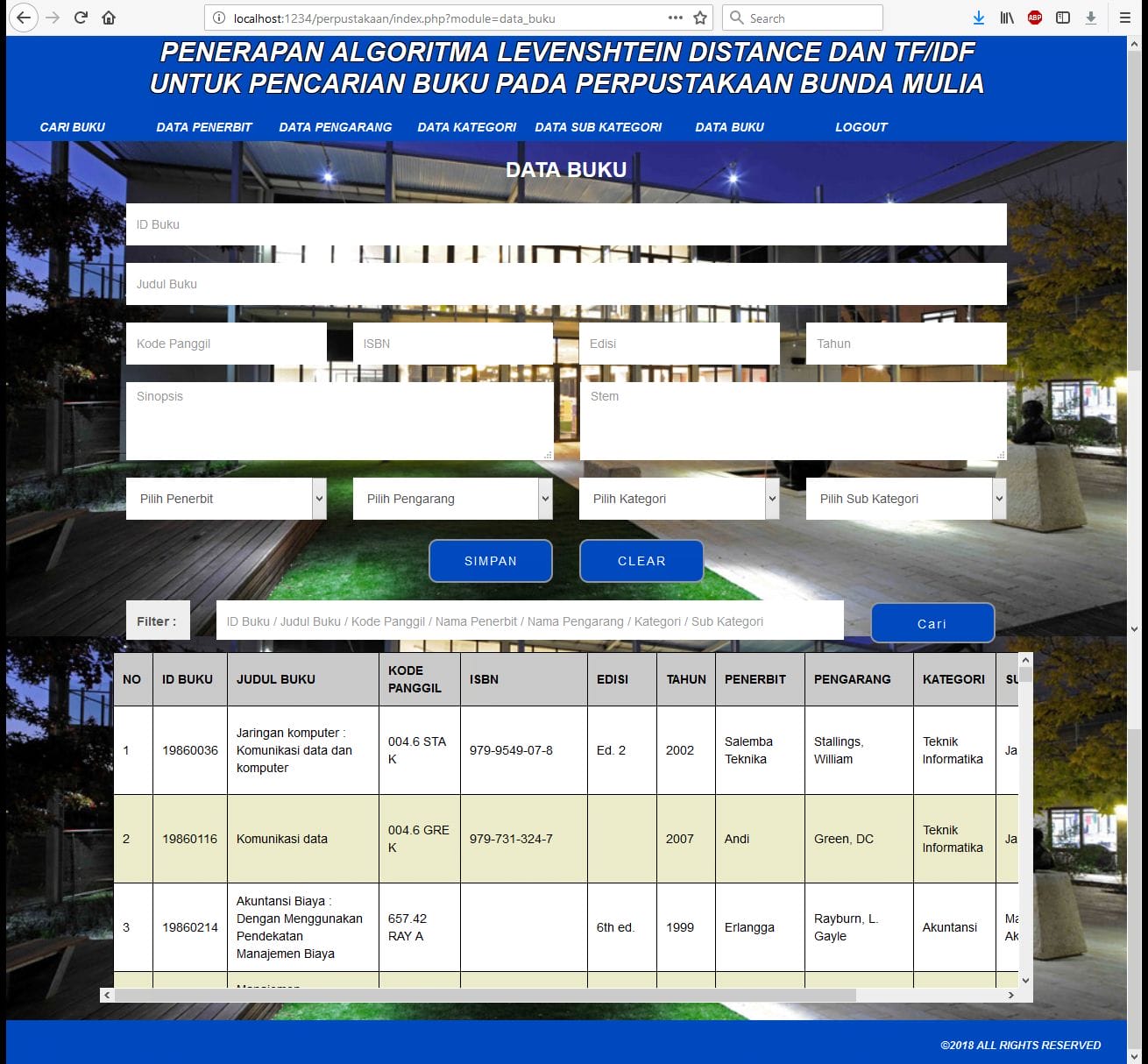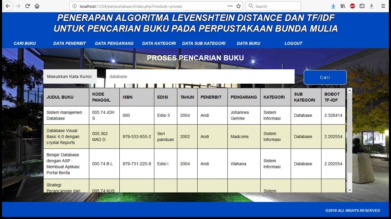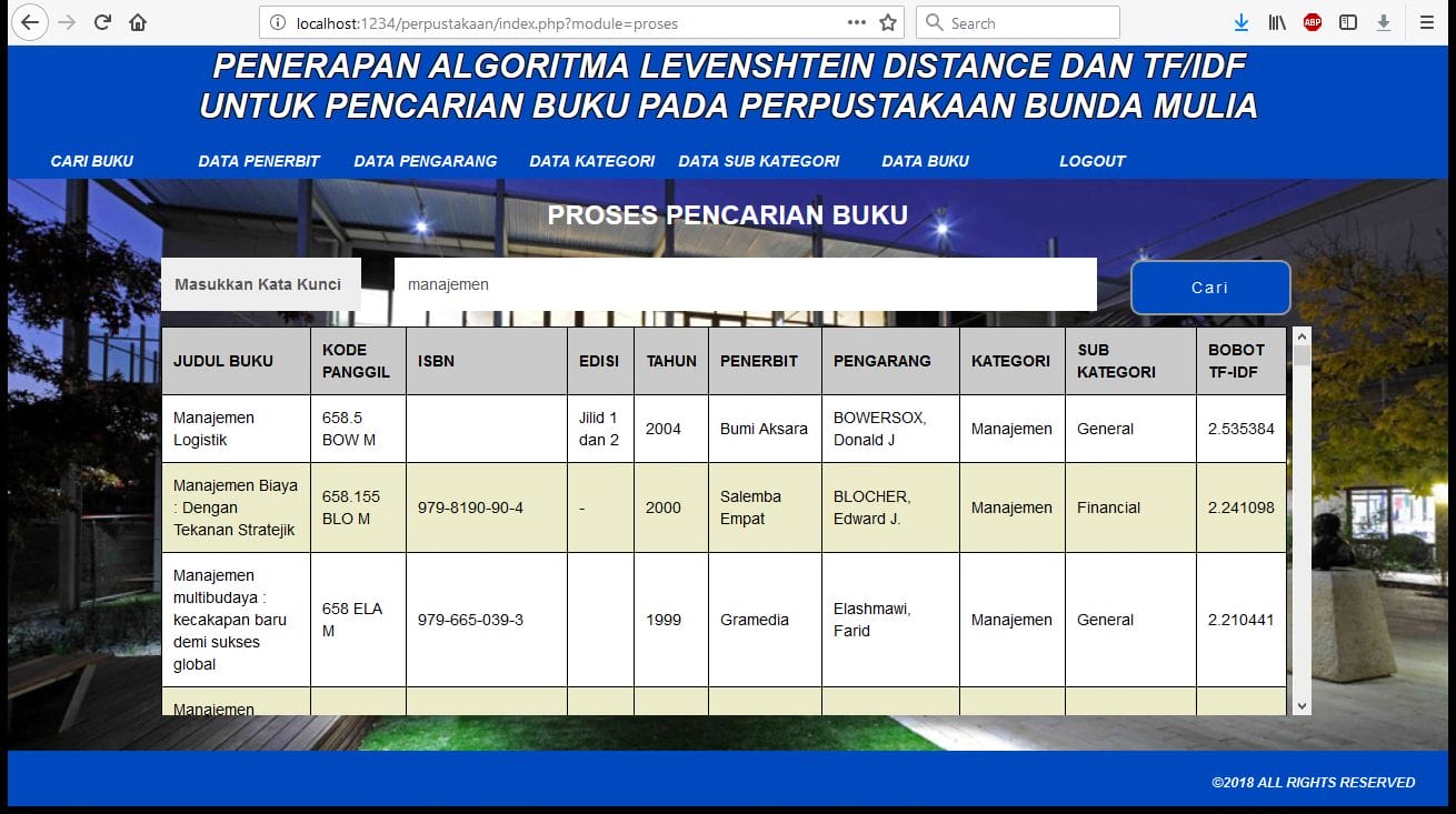 | Fungsi utama aplikasi ini adalah menampilkan urutan data buku yang paling relevan dengan kata kunci yang diinputkan. Data yang digunakan adalah sejumlah data buku yang memiliki hubungan dengan beberapa data lain seperti data penerbit, pengarang, kategori, dan sub kategori. Setelah memasukkan kata kunci yang digunakan, sistem akan melakukuan proses perhitungan pada semua data buku dan menampilkan urutan data buku yang paling relevan dengan kata kunci tersebut. Pembobotan akan lebih dibebankan kepada kriteria kategori, kemudian sub kategori, dan kemudian barulah menggunakan judul buku. | |