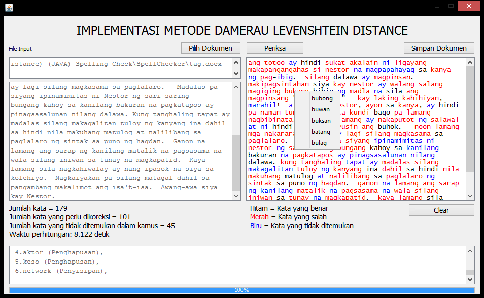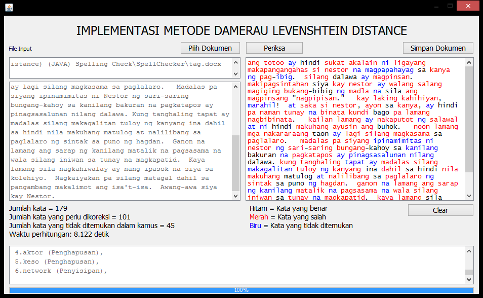 | Fungsi utama aplikasi ini adalah untuk melakukan koreksi atas kata-kata yang tidak ditemukan dalam kamus. Input yang digunakan adalah sebuah dokumen bertipe doc atau docx. Setelah pengguna memilih dokumen, sistem akan mencari dan menandai setiap kata yang tidak ditemukan pada kamus. Jika terdapat kata pada kamus yang mirip seperti kata pada dokumen, maka kata tersebut akan ditandai dengan warna merah, selain itu akan ditandai dengan warna biru. Jika pengguna melakukan klik kanan pada kata berwarna merah, maka akan muncul rekomendasi kata yang dapat dipilih untuk mengkoreksi kata tersebut. Jika pengguna melakukan klik kanan pada kata berwarna biru, maka akan muncul pilihan untuk menambahkan kata tersebut ke dalam kamus sehingga dapat dikenali untuk proses analisa di kemudian hari. Setelah koreksi dinyatakan sudah selesai, maka pengguna dapat menyimpan dokumen yang sudah dikoreksi tersebut. | |
