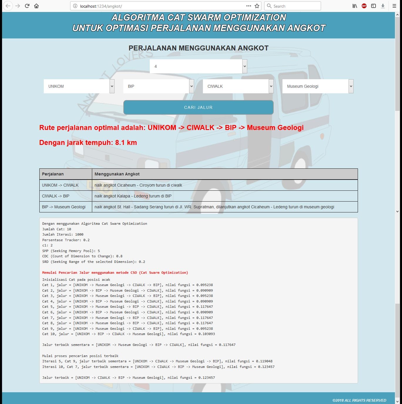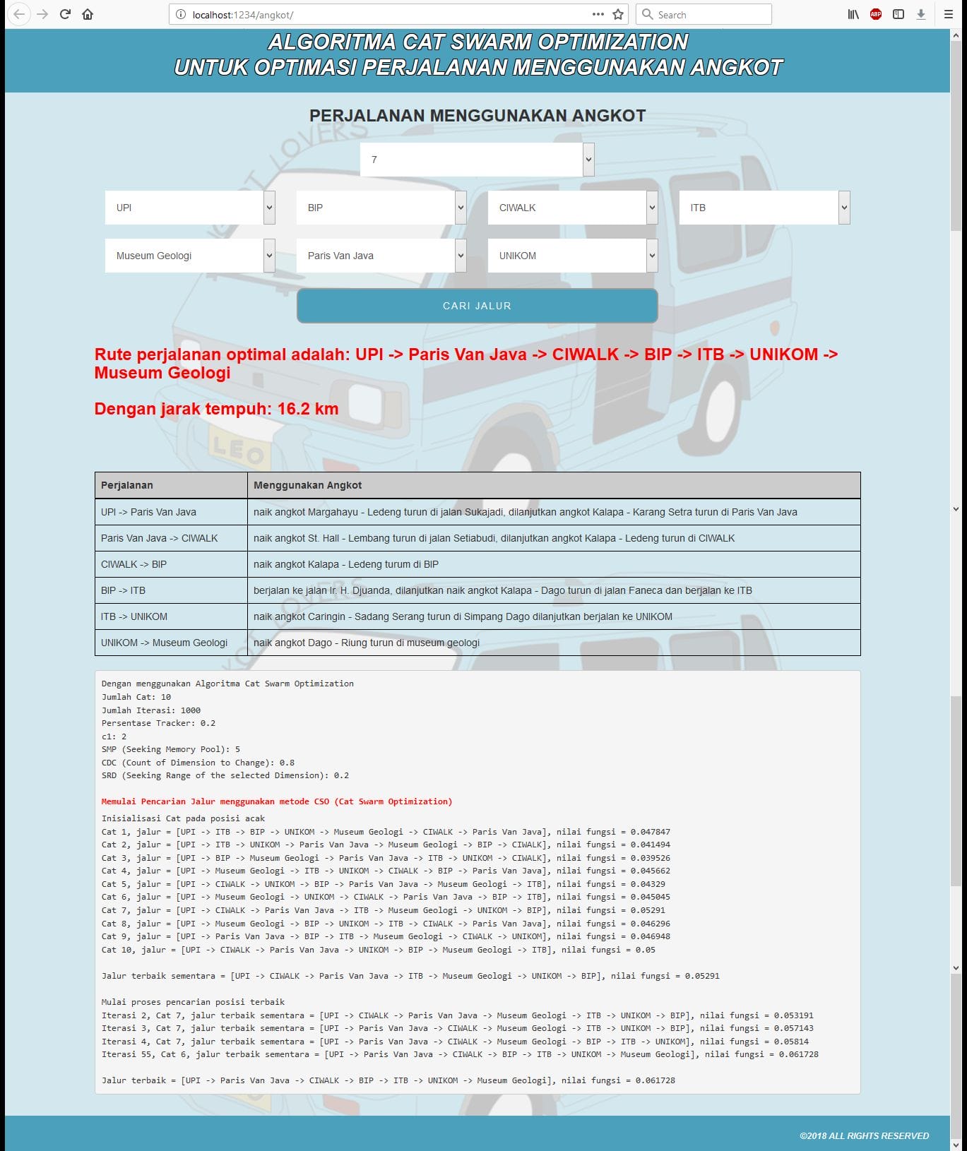 | Fungsi utama aplikasi ini adalah menampilkan jalur terbaik sebaiknya digunakan oleh pengguna dalam bepergian dari sebuah titik menuju titik lainnya. Data yang digunakan adalah data lokasi beserta dengan jarak menuju lokasi lain dan keterangan sistem pengambilan angkutan umum yang benar. Pengguna hanya perlu memasukkan lokasi awal dan beberapa lokasi tujuan yang hendak dikunjungi, kemudian sistem akan melakukan perhitungan untuk mencari jalur terbaik menuju lokasi tersebut dan menampilkan hasil kesimpulan pada layar. Metode yang digunakan adalah metode CSO (Cat Swarm Optimization). Tutorial metode ini dapat dilihat pada link diatas. | |