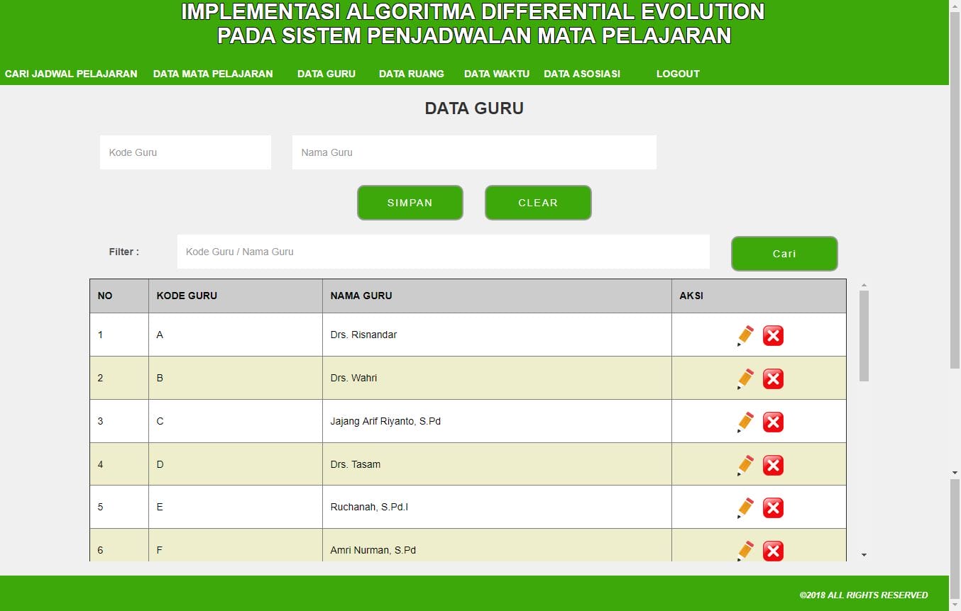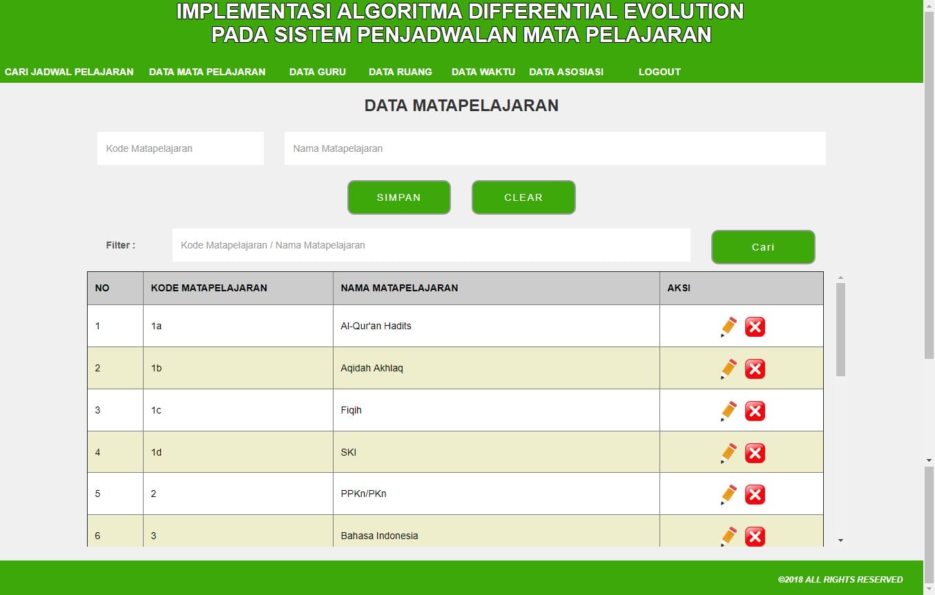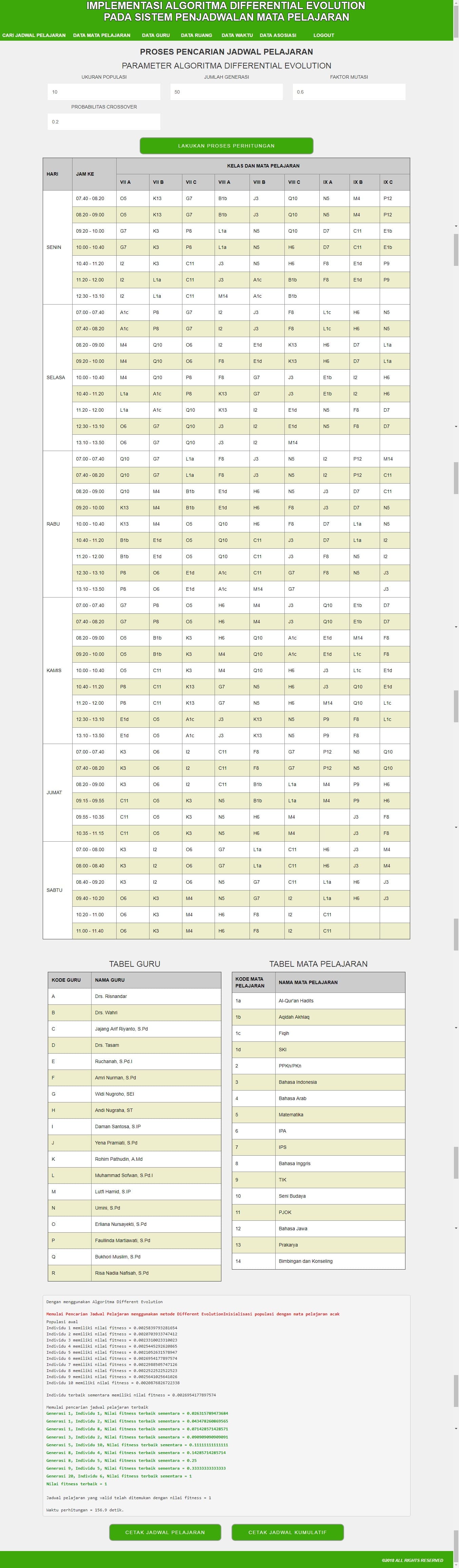 | Fungsi utama aplikasi ini adalah untuk menemukan jadwal mata pelajaran dengan batasan inputan mata pelajaran dan guru. Ada sejumlah inputan mata pelajaran, nama guru, kelas, waktu, dan tabel asosiasi pengajaran yang berisi data hubungan kemampuan antara guru dan mata pelajaran yang diampu. Dengan banyaknya parameter dan berbagai batasan yang tersedia, maka sistem kemudian akan menghitung dan mencari jadwal pelajaran yang valid dan memenuhi semua syarat. Hasil penjadwalan kemudian ditampilkan pada layar dan terdapat sebuah fitur untuk mencetak jadwal yang baru dihasilkan tersebut. Metode yang digunakan adalah metode DEA (Differential Evolution Algorithm). Tutorial metode ini dapat dilihat pada link diatas. | |