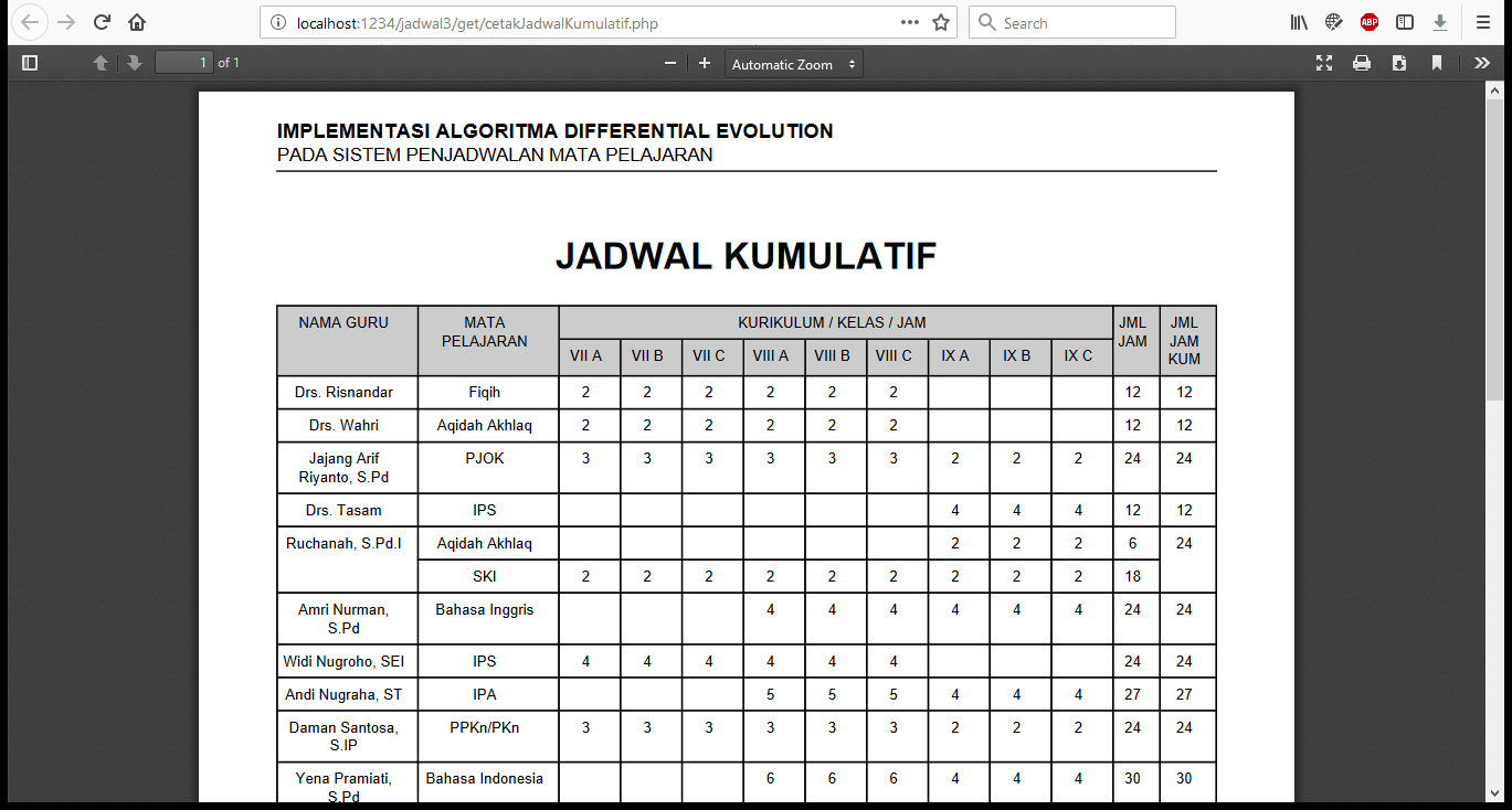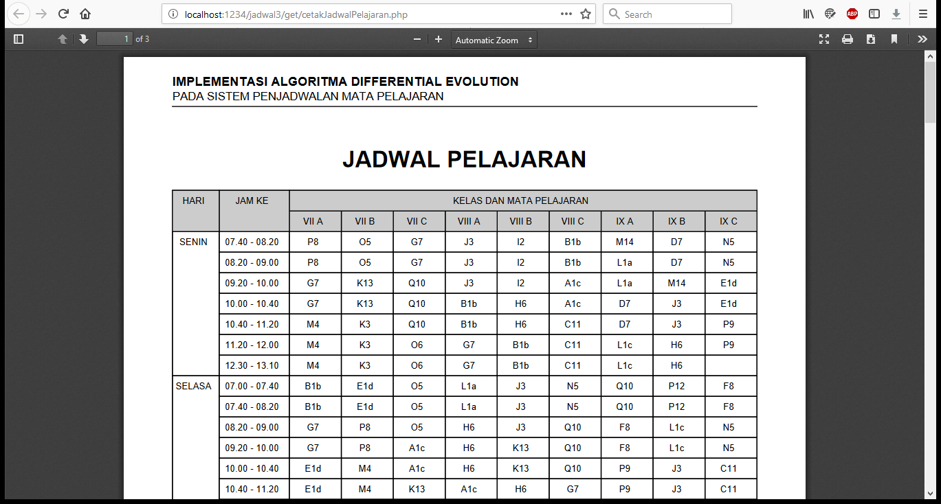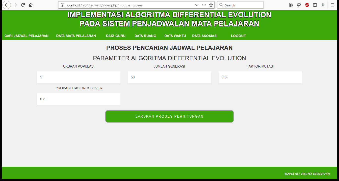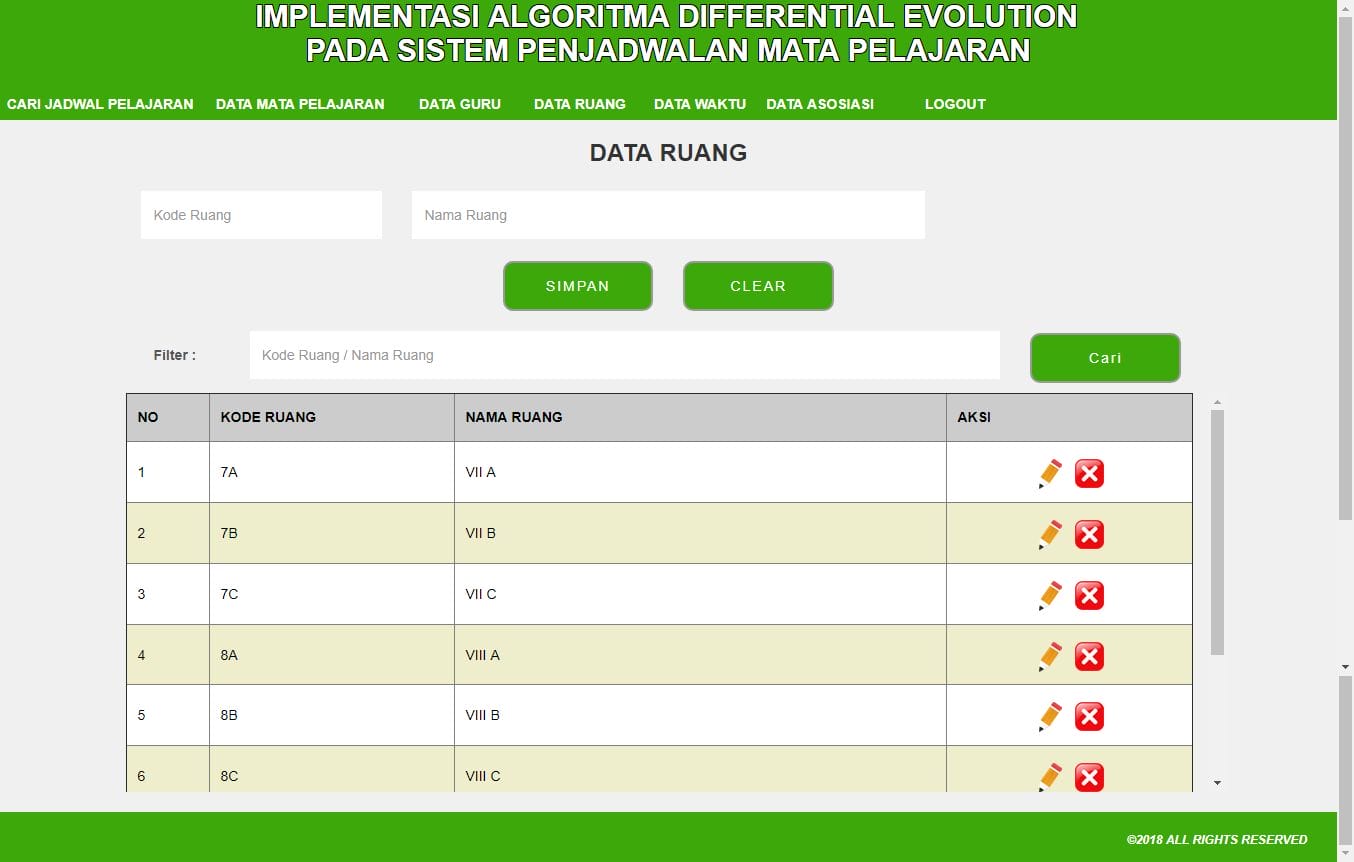 | Fungsi utama aplikasi ini adalah untuk menemukan jadwal mata pelajaran dengan batasan inputan mata pelajaran dan guru. Ada sejumlah inputan mata pelajaran, nama guru, kelas, waktu, dan tabel asosiasi pengajaran yang berisi data hubungan kemampuan antara guru dan mata pelajaran yang diampu. Dengan banyaknya parameter dan berbagai batasan yang tersedia, maka sistem kemudian akan menghitung dan mencari jadwal pelajaran yang valid dan memenuhi semua syarat. Hasil penjadwalan kemudian ditampilkan pada layar dan terdapat sebuah fitur untuk mencetak jadwal yang baru dihasilkan tersebut. Metode yang digunakan adalah metode DEA (Differential Evolution Algorithm). Tutorial metode ini dapat dilihat pada link diatas. | |