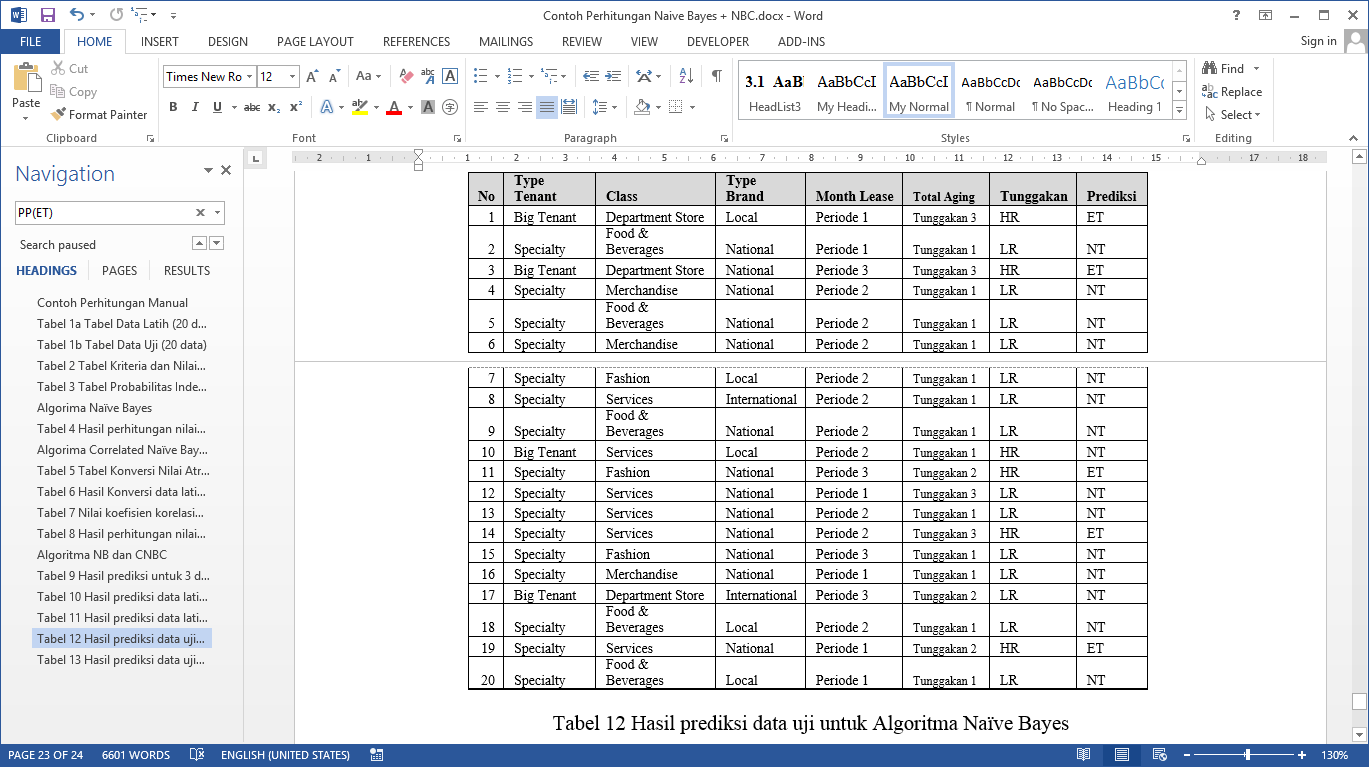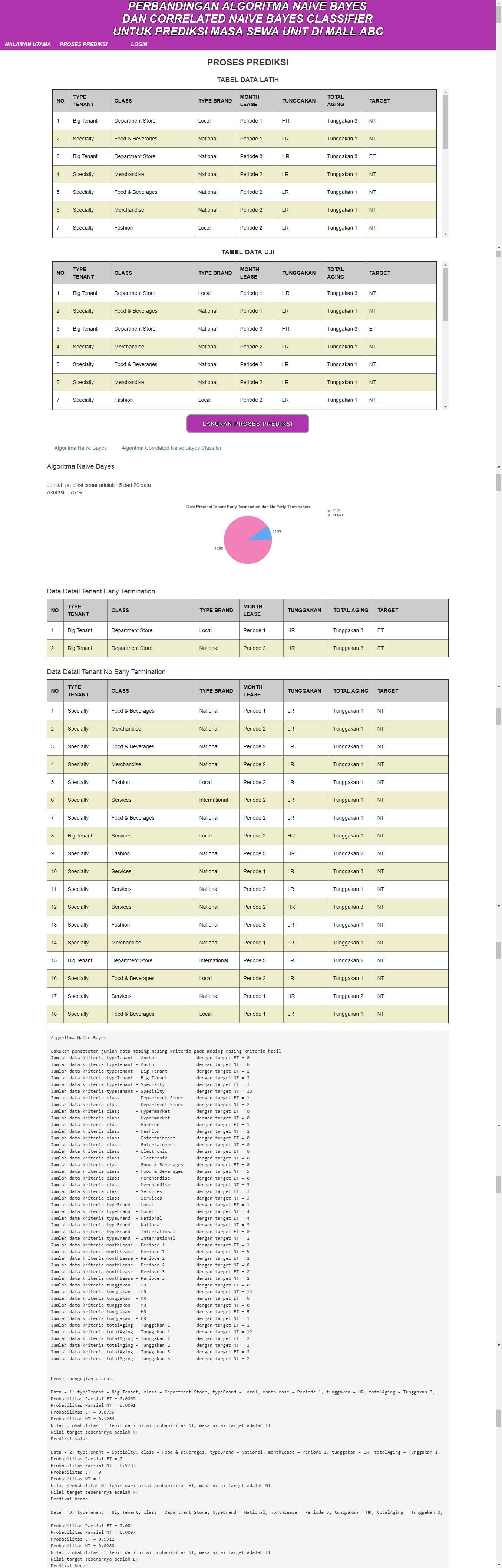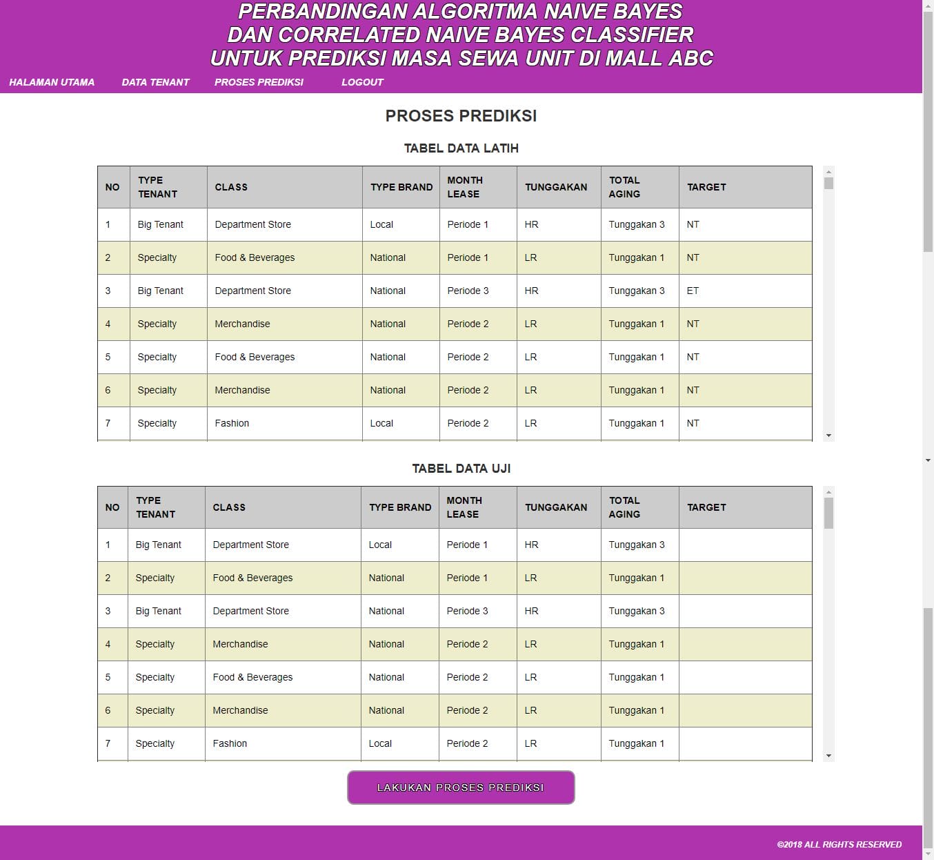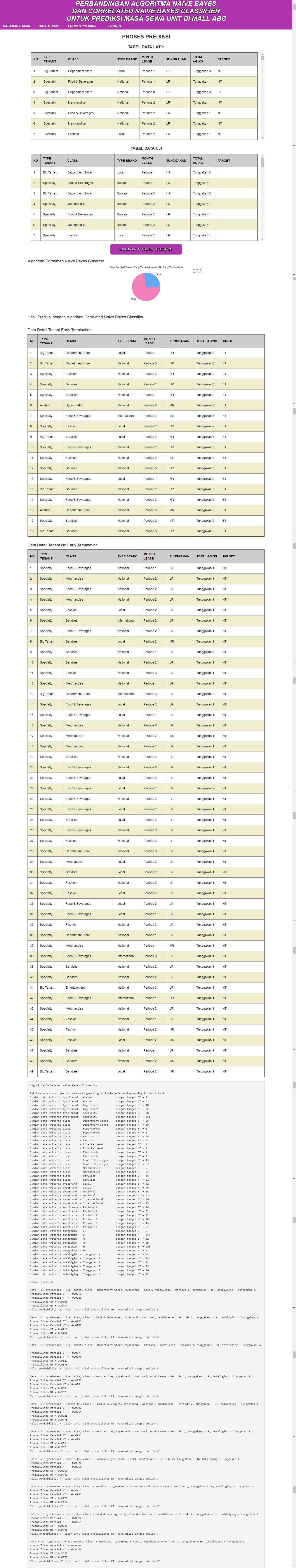 | Fungsi utama aplikasi ini adalah untuk melakukan pengujian akurasi antara kedua buah metode yang digunakan dalam perhitungan sehingga diketahui algoritma manakah yang lebih baik. Data yang digunakan adalah data tenant dalam kurun waktu tertentu yang dapat dimasukkan sekaligus dengan sistem impor dari file. Tidak ada parameter yang digunakan sebagai input sehingga sistem akan menampilkan hasil pehitungan akurasi dari kedua algoritma tersebut dalam bentuk grafik setelah pengguna menekan tombol pengujian. Metode yang digunakan adalah metode NBIC (Naive Bayes Inference Clustering) dan Correlated Naive Bayes Clustering. Tutorial metode ini dapat dilihat pada link diatas. | |