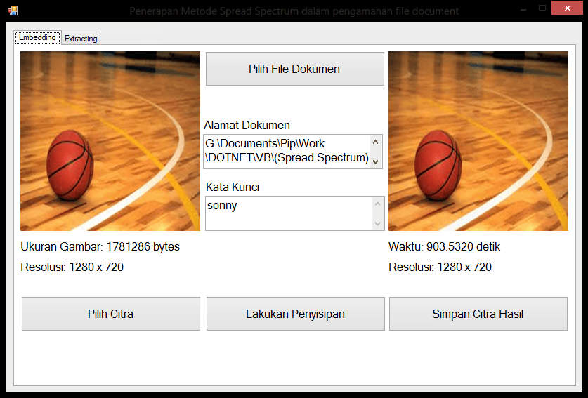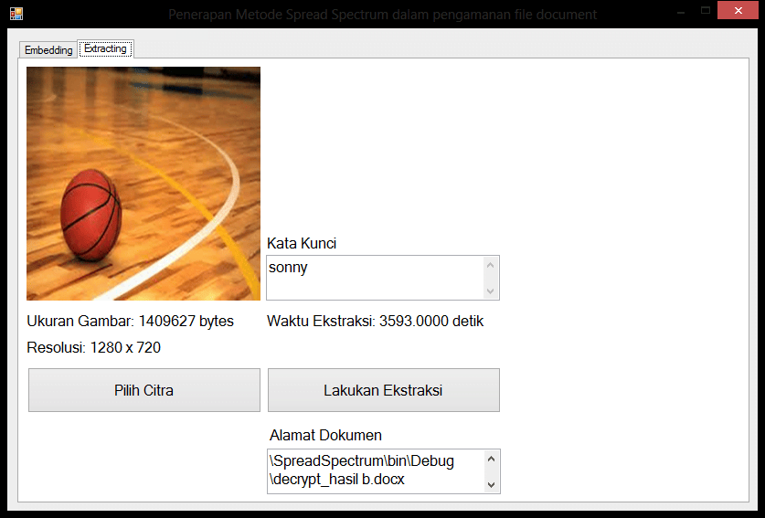 | Fungsi utama aplikasi ini adalah untuk menyisipkan data file dokumen bertipe tertentu kedalam sebuah citra tanpa merusak citra tersebut. Input yang digunakan adalah citra bertipe bmp dan file dokumen bertipe .doc dan .docx. Sistem kemudian akan melakukan penyisipan file ke dalam citra tersebut. Proses berikutnya adalah proses ekstraksi dokumen dari citra hasil pemrosesan. Setelah melakukan ekstraksi, sistem kemudian akan melakukan pembacaan dokumen tersebut. Tentu saja dokumen harus kembali seperti aslinya dan dapat dibaca seperti biasa tanpa mengalami perubahan karakter. Metode yang digunakan adalah metode Spread Spectrum dan LSB (Least Significant Bit). Tutorial metode ini dapat dilihat pada link diatas. | |