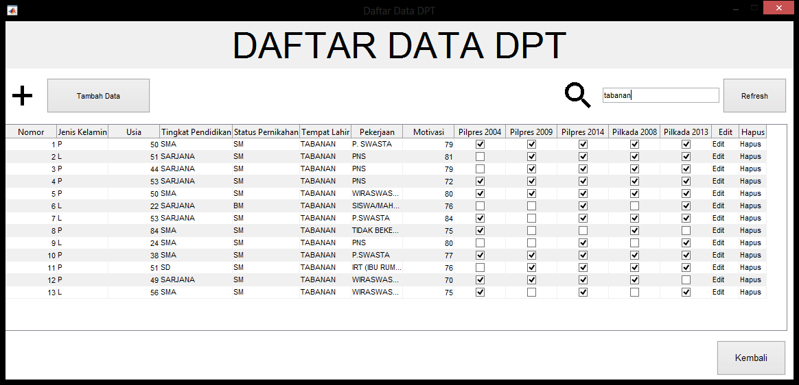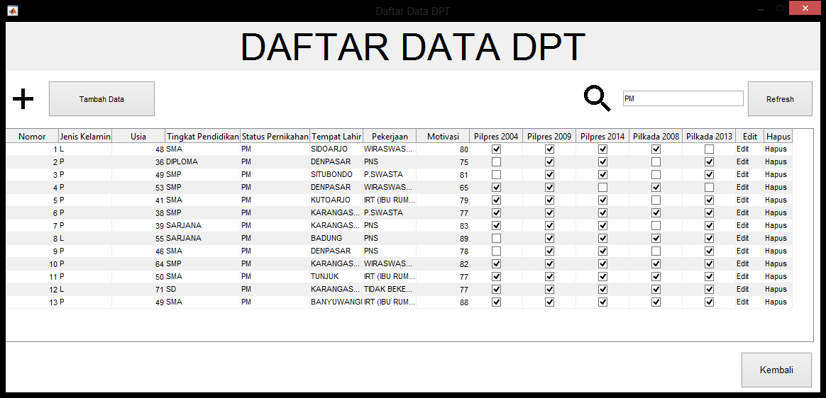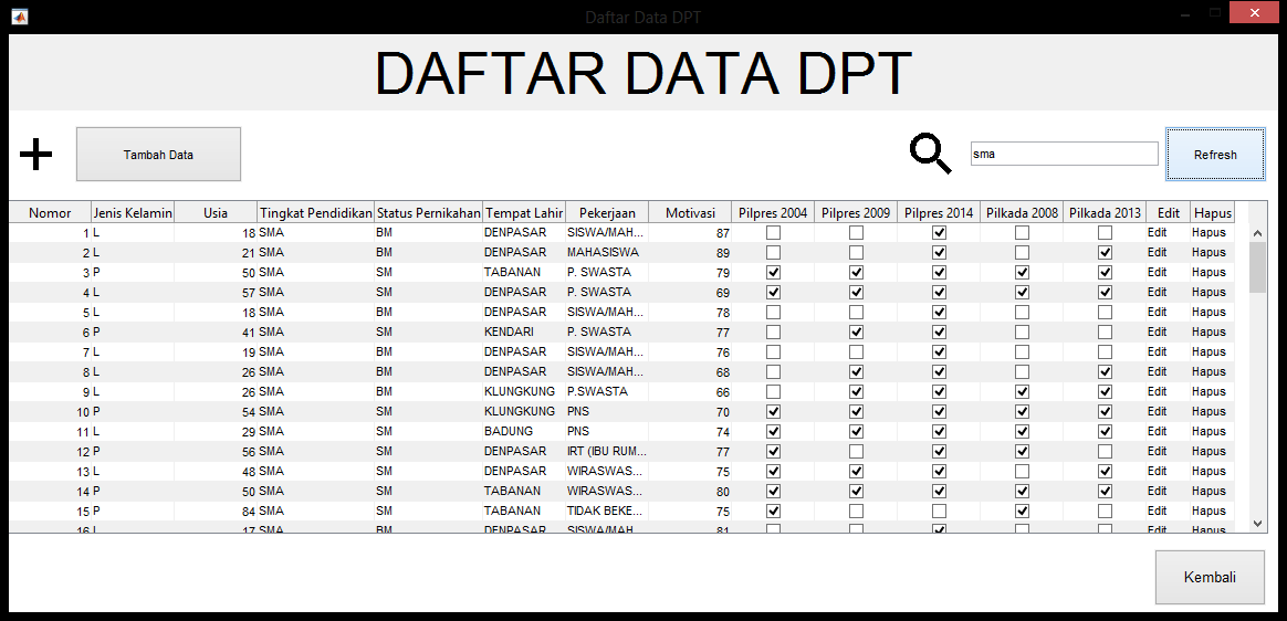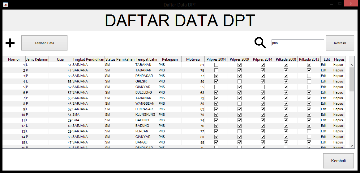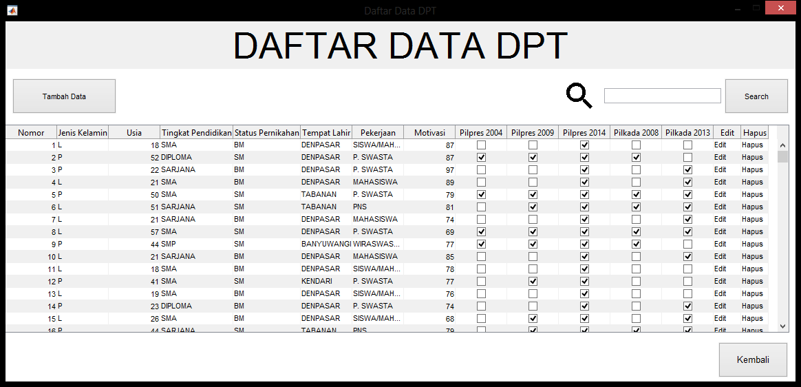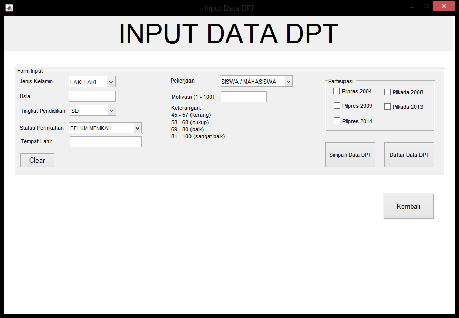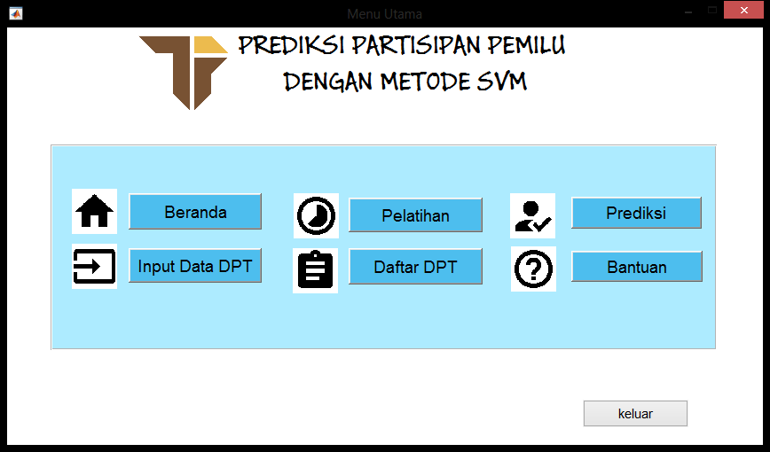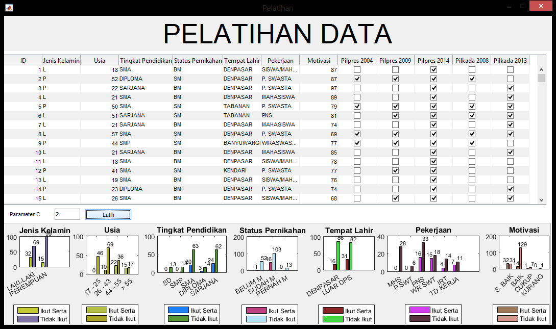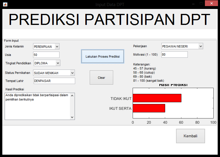 | Fungsi utama aplikasi ini adalah untuk melakukan prediksi apakah seseorang akan berpartisipasi dalam pemilu berikutnya jika melihat dari data-data sebelumnya. Data yang digunakan adalah data partisipan tetap yang telah mengikuti atau tidak mengikuti pemilu selama beberapa periode lampau, dan data tersebut memiliki beberapa kriteria seperti jenis kelamin, usia, pekerjaan, dst. Pertama-tama sistem akan melakukan pelatihan dengan menggunakan keseluruhan data tersebut, dan kemudian pengguna dapat memasukkan kriteria data diri dan melakukan pengujian apakah pengguna ini akan mengikuti pemilu di masa mendatang atau tidak. Hasil persentase antara berpartisipasi dan tidak berpartisipasi akan ditampilkan pada layar sebagai jawaban Metode yang digunakan adalah metode SVR (Support Vector Regression). Tutorial metode ini dapat dilihat pada link diatas. | |