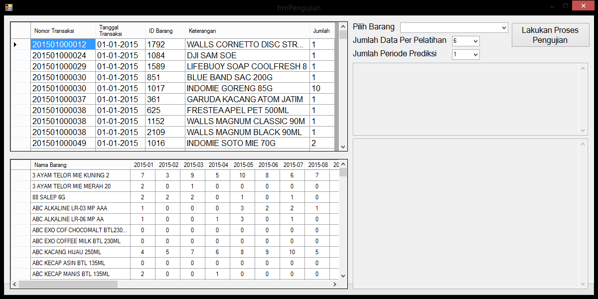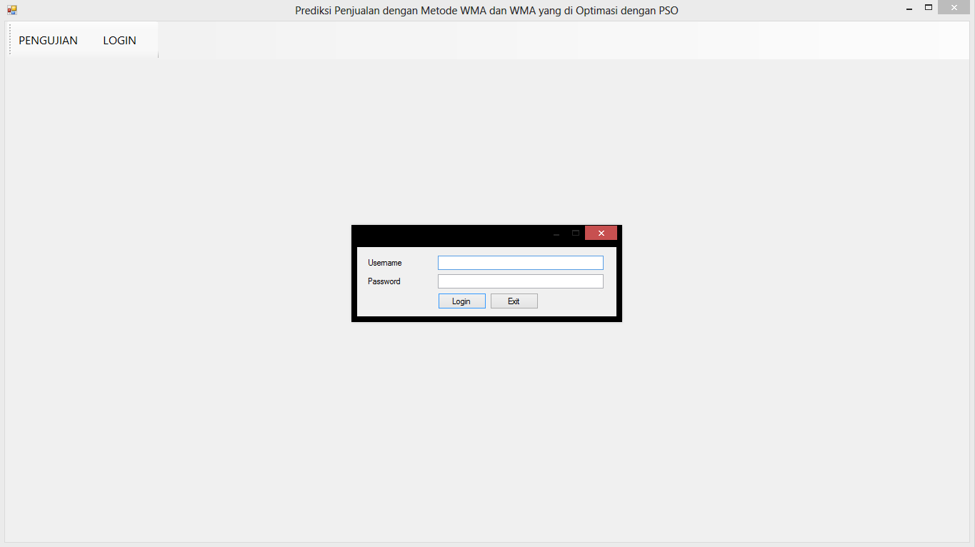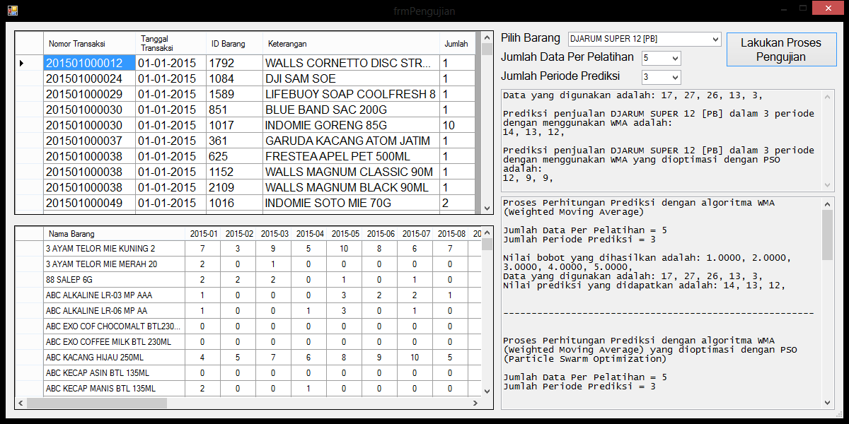| Fungsi utama aplikasi ini adalah untuk melakukan peramalan penjualan berdasarkan data penjualan pada periode sebelumnya. Data yang tersedia adalah data penjualan dari berbagai macam produk dalam kurun waktu tertentu. Pengguna dapat memilih produk manakah yang ingin diketahui prediksinya, beserta dengan banyaknya jumlah data yang dipakai dan jumlah prediksi yang ingin dilakukan, kemudian sistem akan melakukan perhitungan dan menampilkan nilai prediksi tersebut pada tempat yang sudah disediakan. Penggunaan metode sebenarnya terdapat 2 macam yaitu untuk membandingkan sistem yang dihasilkan oleh WMA dan WMA yang dioptimasi dengan PSO. Tutorial metode ini dapat dilihat pada link diatas. | |