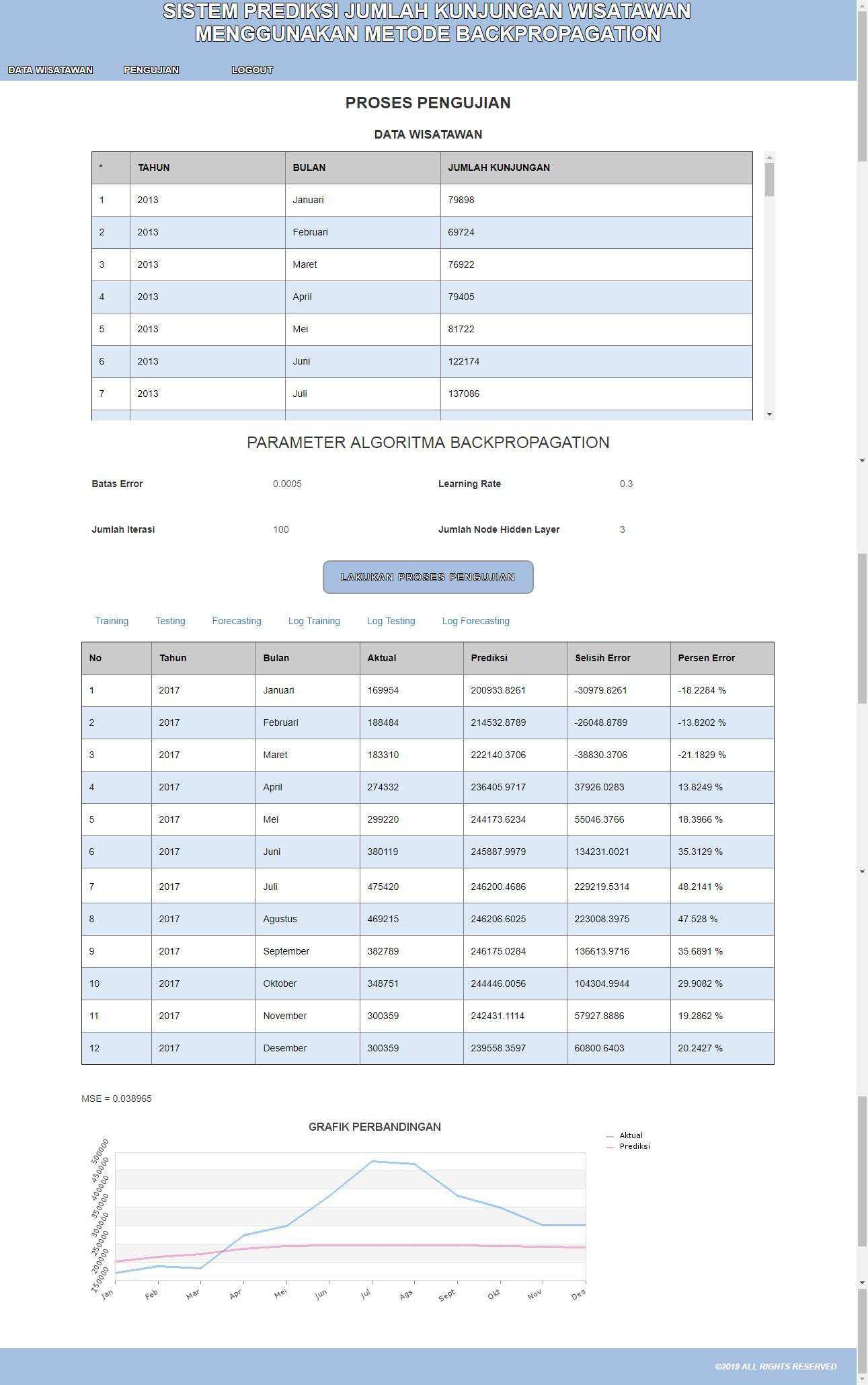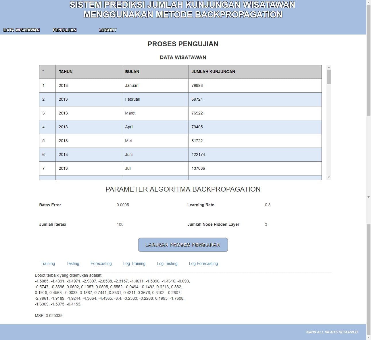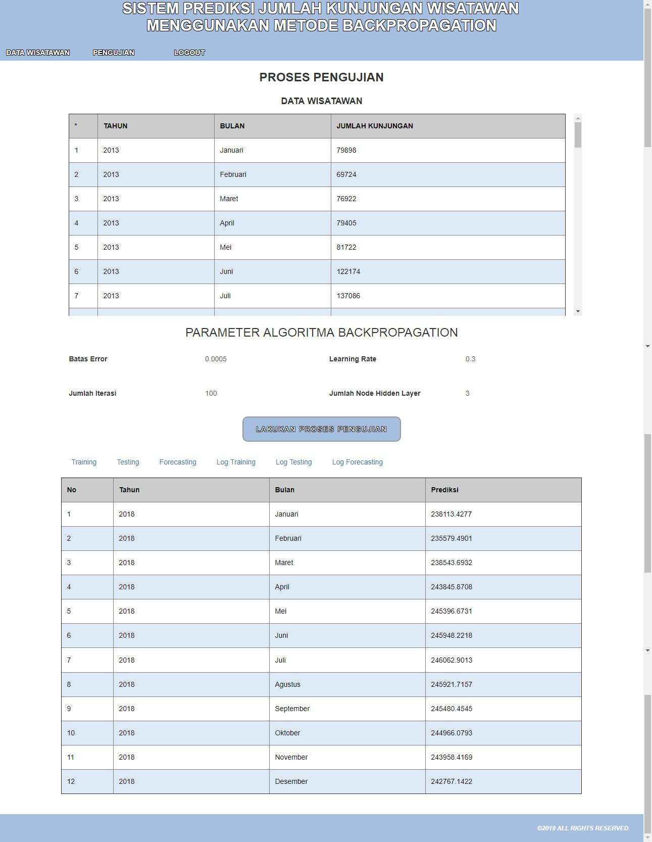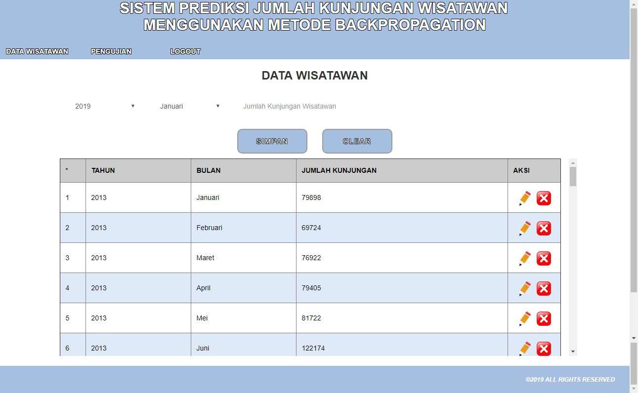 | Terdapat 2 buah menu utama pada aplikasi ini. Menu data wisatawan digunakan untuk menyimpan jumlah data wisatawan yang dikelompokan per bulan selama beberapa tahun terakhir. Sedangkan menu pengujian berfungsi untuk melakukan proses pengujian terhadap data tersebut. Data akan dibagi menjadi dua yaitu data latih dan data uji dan kemudian pengujian dilakukan terhadap 2 jenis data tersebut. Setelah kedua tahapan tersebut maka hasil pelatihan digunakan untuk memprediksikan data untuk periode berikutnya. Hasil perhitungan dari ketiga fitur ini kemudian ditampilkan pada layar. | |