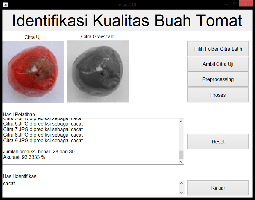 | Aplikasi ini bertujuan untuk melakukan klasifikasi terhadap jenis tomat sehingga dapat diketahui kualitas dari tomat tersebut. Data yang digunakan adalah sejumlah data citra buah tomat yang baik dan buruk. Tombol “Pilih Folder Citra Latih” dan “Ambil Citra Uji” berfungsi seperti nama tombol tersebut. Tombol preprocessing dilakukan untuk mendapatkan citra grayscale beserta dengan beberapa proses lain, sedangkan tombol proses digunakan untuk melakukan klasifikasi terhadap citra uji yang dipilih. | |