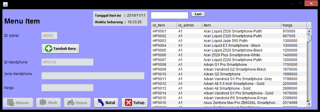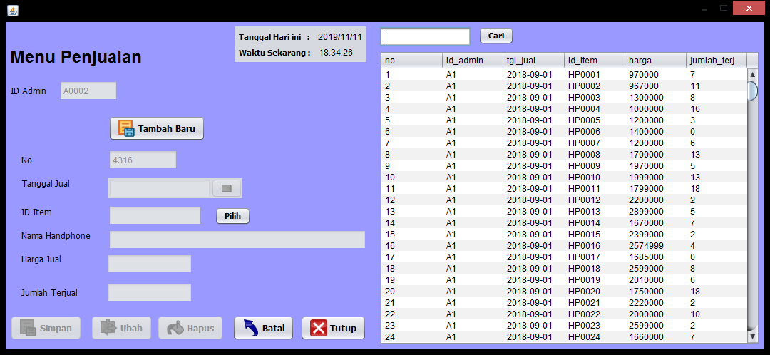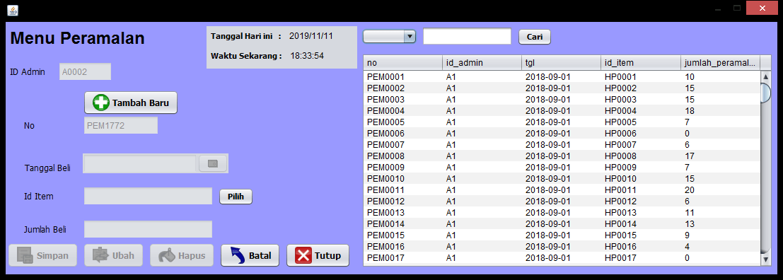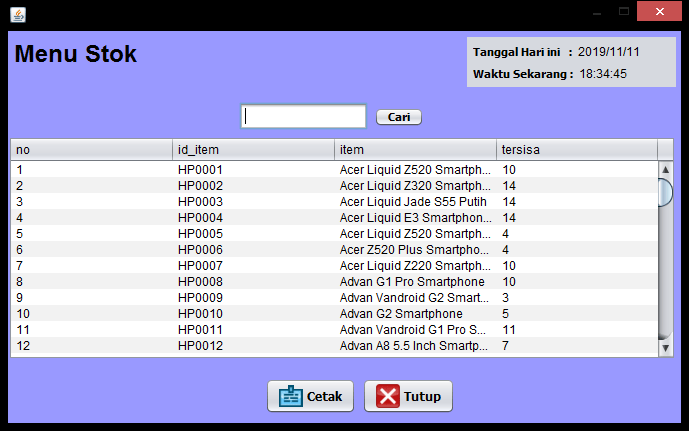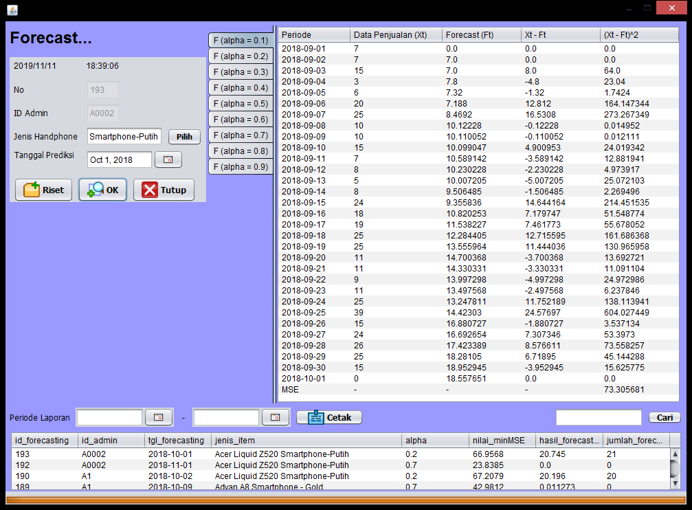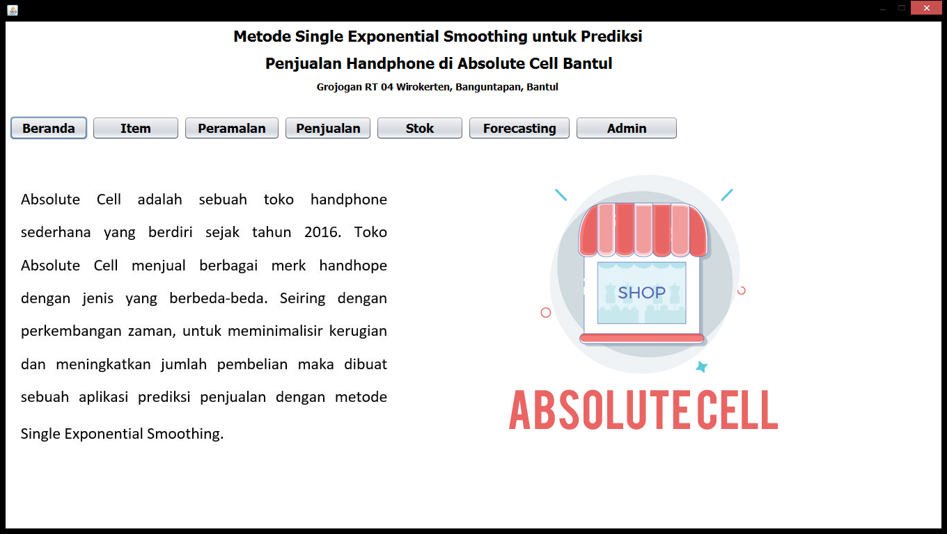 | Aplikasi ini bertujuan untuk melakukan pencatatan pembelian dan penjualan handphone, beserta dengan sebuah sistem yang dapat memperkirakan penjualan handphone dikemudian hari. Menu pembelian dan penjualan berfungsi untuk melakukan transaksi pembelian dan penjualan yang tentunya berkaitan dengan stok barang yang dapat dilihat pada menu stok. Menu Forecasting digunakan untuk memperkirakan penjualan. Setelah memilih jenis HP dan waktu prediksi, maka sistem akan melakukan perhitungan prediksi per hari yang akan ditampilkan pada layar. Dengan demikian pengguna akan dapat memperkirakan jumlah stok untuk jenis HP tersebut agar tidak terlalu banyak ataupun sedikit. Metode yang digunakan adalah metode Exponential Smoothing. Tutorial metode ini dapat dilihat pada link diatas. | |