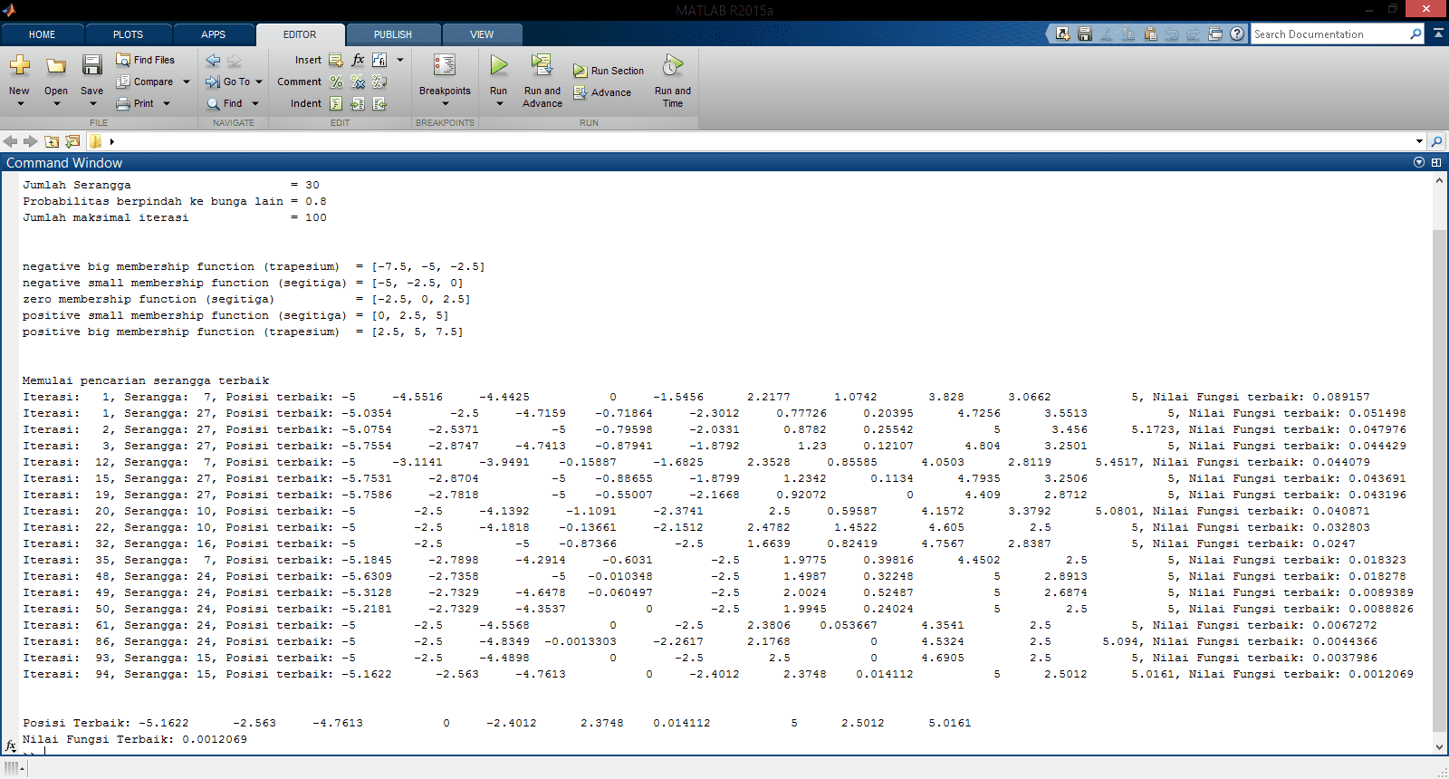 | Aplikasi ini hanya memiliki sebuah tujuan yaitu mendapatkan setting terbaik yang nantinya dapat digunakan pada studi kasus. Data yang tersedia hanyalah batasan tertentu dari fungsi keanggotaan fuzzy, dan berdasarkan setting tersebut sistem akan berusaha untuk mendapatkan nilai output yang menghasilkan nilai fungsi terbaik. | |