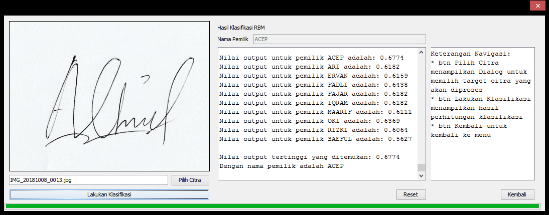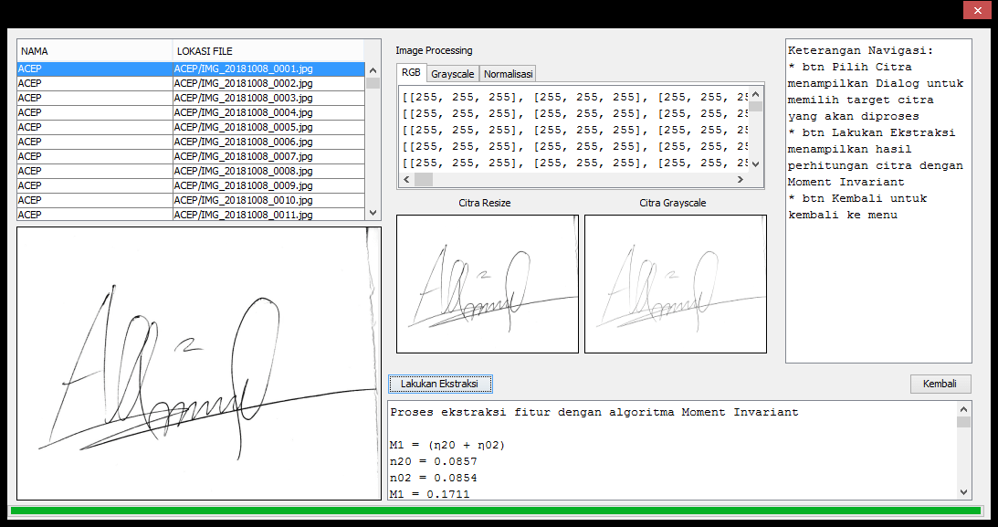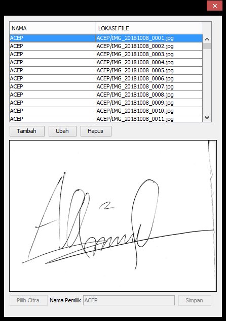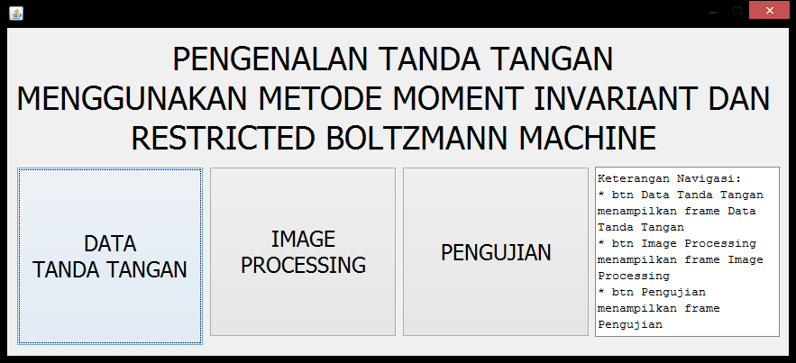 | Terdapat 3 menu utama yang tersedia pada aplikasi ini. Menu tanda tangan berfungsi untuk menyimpan data citra tanda tangan yang dimasukkan ke dalam database. Menu Image Processing berfungsi untuk melakukan ekstraksi fitur terhadap citra tanda tangan yang dipilih. Hasil ekstraksi fitur yang didapatkan dari masing-masing citra kemudian akan digunakan oleh sistem untuk melakukan prediksi terhadap data citra yang diujikan pada menu Pengujian. | |
