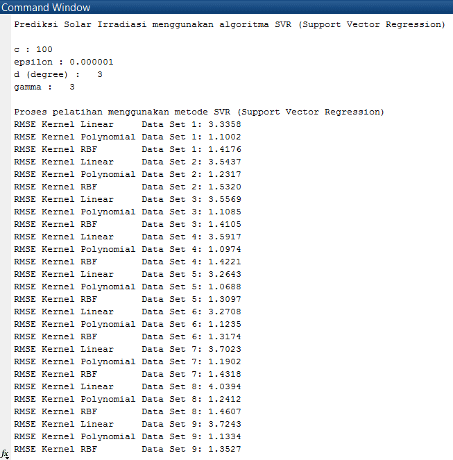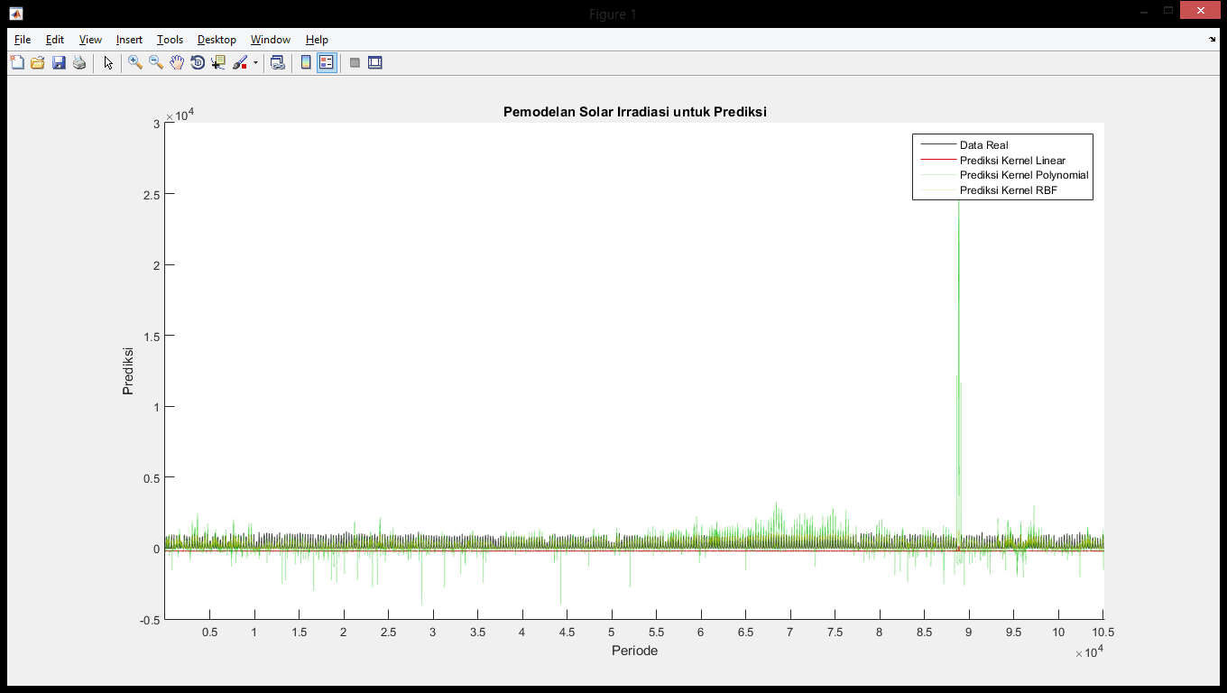 | Aplikasi ini bertujuan untuk membandingkan antara data solar irradiation dengan hasil prediksi apabila menggunakan algoritma SVM. Data yang digunakan adalah sejumlah data statistik dengan 6 buah kriteria yang diambil dalam rentang 5 menit selama satu tahun. Perhitungan dilakukan dengan menggunakan 3 buah kernel berbeda, yaitu Linier, Polinomial dan RBF, yang kemudian saling dibandingkan dan ditampilkan dalam bentuk grafik. | |